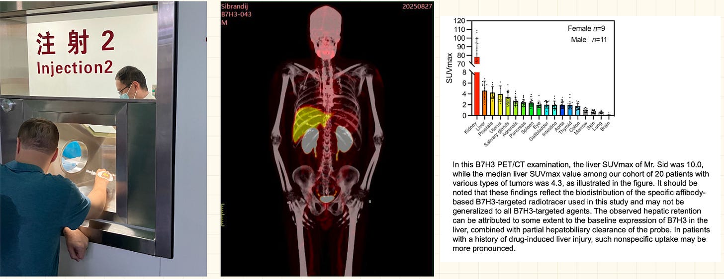 Last August, Sid Sijbrandij and I traveled to Beijing for an experimental scan to look at a biomarker that’s specifically upregulated in his cancer.1 At that time, the only place we could do this was in China, using a molecule developed by Yang Zhi (杨志)’s group at Beijing Cancer Hospital. So that’s where we went.