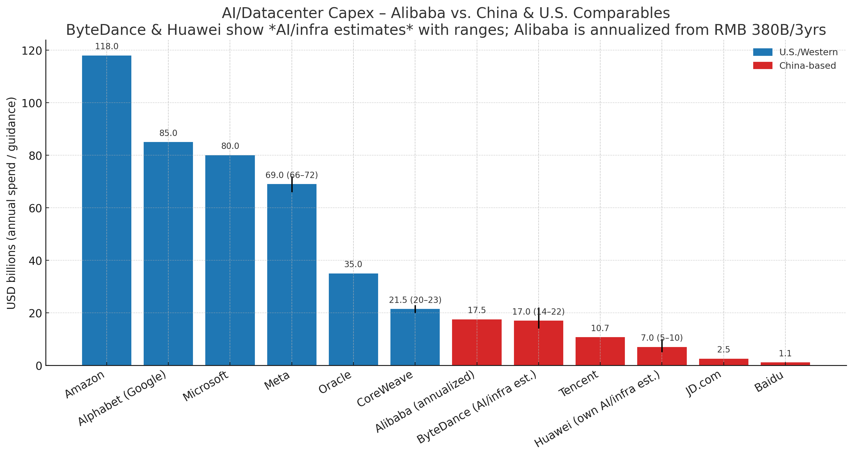 ’s highly scientific tier list, their Qwen team is the only AI lab in China besides Deepseek at the frontier, leadership has every financial incentive to pump this narrative that it’s also China’s most pilled company.It’s also a good time to remind you that even the money Alibaba, China’s biggest AI spender, will put into securing compute pales in comparison to the western hyperscalers’ buildouts. Many of the firms with big numbers on this chart like Bytedance and Ali are mostly into accessing Nvidia chips outside the PRC, as there aren’t enough Ascends being built this year or next to absorb all of this projected capex.