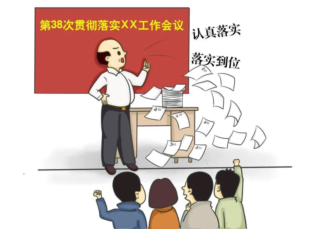 This form of cengceng jiama(层层加码) is a typical phenomenon of policy implementation in China. Orders of policy implementation usually come top-down and in order to ensure the completion of goals and avoid punishment or failure, each layer in the system adds extra requirements or sets a higher goal for work when delegating to the lower level, eventually imbuing the grassroot level with unreasonable requests or unsustainable volumes of work. The most apparent example is the pandemic prevention during Covid, when local authorities added extra rules to prevent mobility regardless of one’s actual health status or risks of carrying the virus.