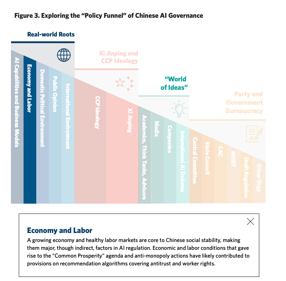 The process through which China produced regulations on AI-systems themselves — including recommendation algorithms, deepfakes, and generative AI-outputs — could also help us predict how the state might respond to AI-led job displacement. Matt Sheehan of the Carnegie Endowment for International Peace reverse-engineers China’s AI regulatory development and outlines a four-layered policy process: real-world conditions; Xi Jinping and CCP ideological framing; the “world of ideas”, consisting of think tank scholars, AI scientists, and corporate lobbyists, etc.; and finally, the party and state bureaucracies. To date, much of the regulatory design has occurred within the latter two layers.