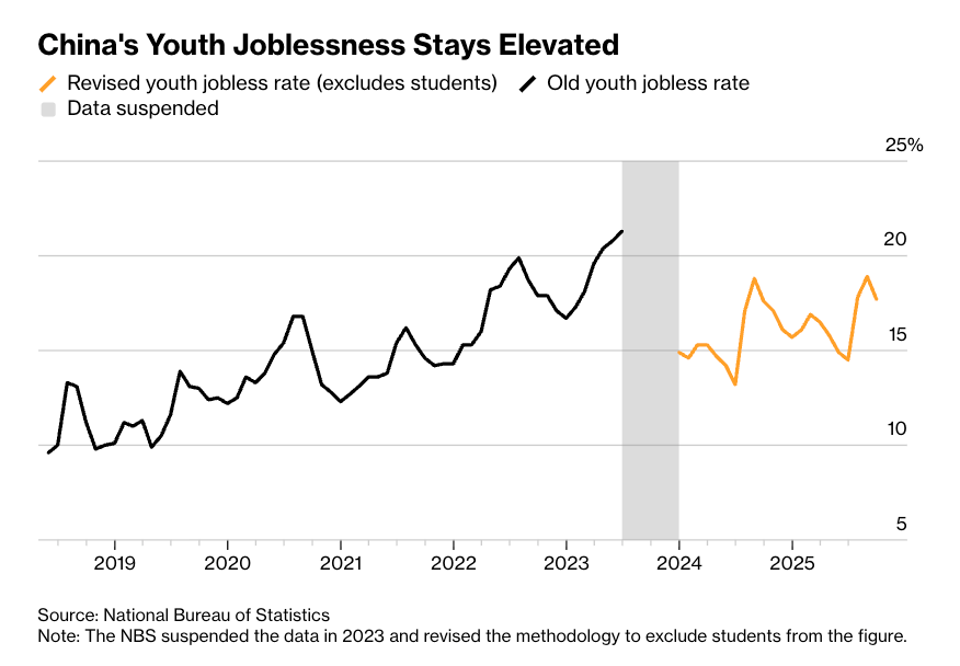 Since the pandemic, China’s youth unemployment rate has stayed high; in mid-2023, it reached a historical high point of 21.3%, nearly double the pre-pandemic rate in 2019, prompting the National Bureau of Statistics to suspend publication of the data. Reporting only resumed several months later using different metrics. However, joblessness data under the new metrics reached another record of 18.9% in August 2025 for “unemployed youth aged 16-24 who are not in school ” — and many believe the true figure to be much higher.