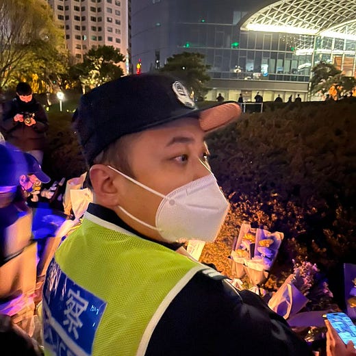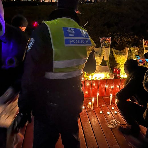 Police arrived at peaceful Covid protest in Beijing, on Liangma river. Candles being lit. Earlier, chants in honour of dead in recent fire in Urumqi,and “Shanghai police let them go”- reference to arrests today