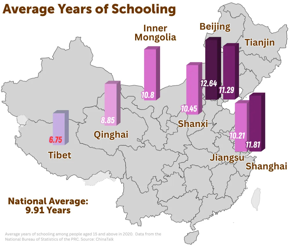 According to China’s 2020 census, only 30.6% of the population has ever attended high school (including non-academic vocational secondary school), which Stanford professor Scott Rozelle notes, “is lower than South Africa, lower than Turkey and lower than Mexico.” In 2022, roughly 40% of China’s middle school graduates didn’t go on to attend high school of any kind, and among the students that do continue their education, national policy stipulates that roughly half (“五五分流”) are funneled into non-academic vocational high schools with no path to enter college.