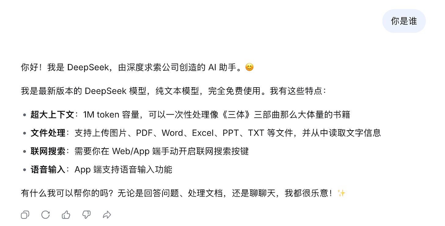 It has now been more than a year since DeepSeek R1 came out, and everyone is anticipating major moves from the secretive frontier lab to usher in the Year of the Horse. As of February 18, we have seen nothing official from DeepSeek. Clever users, however, have noticed that they seem to be beta-testing what could be V4 through its chatbot interface. Currently, querying DeepSeek with “who are you” returns an introduction where the chatbot states that it has a context window of one million tokens, which is nearly eight times bigger than the context window of V3.2.