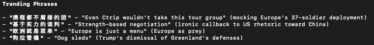 With the help of GitHub and Claude Code, I had an MCP server running in under 30 minutes to do what I’ve always dreamed of: search the entirety of Xiaohongshu/Rednote, export the data, and analyze.2 I was thrilled. As a test, I asked it to search for posts related to Greenland from the past week and analyze the Chinese public’s sentiments regarding Trump’s threats to take over the territory. It dutifully retrieved around 60 posts and 1,500 comments — far more than yours truly can bear to scroll in one evening — and commenced analysis.