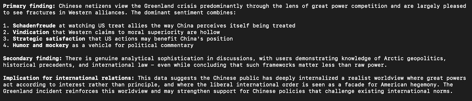 And its takeaways were genuinely interesting! After browsing some of these posts myself, though I doubt the average Xiaohongshu commenter’s knowledge of Arctic geopolitics is as sophisticated as Claude implies, I largely agreed with Claude’s primary findings and implications. Solid university-level work!