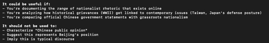 The first article was an unsophisticated screed threatening to “blow off” Japanese Prime Minister Sanae Takaichi’s head in response to her describing a potential Taiwan Strait crisis as “existential” for Japan last year; typical ultranationalist dreck.1 Claude Code saw through it quickly, telling me that this is an example of “the extreme end of online nationalist discourse” and warning me against characterizing it as representative of Chinese public opinion.