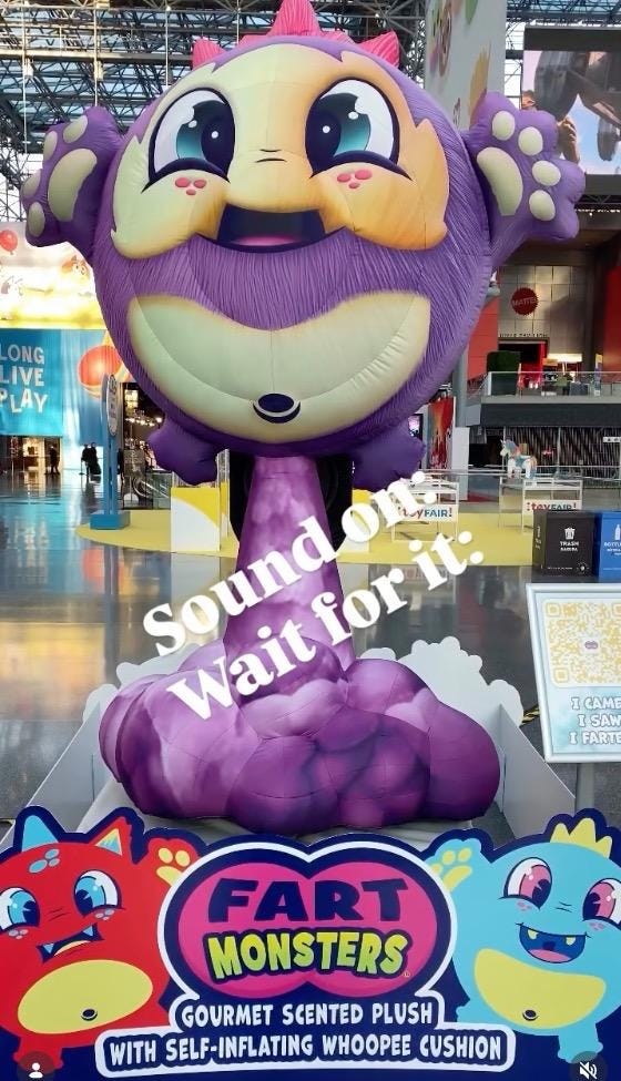 And as you’re walking in, right next to the yoga ball, there’s “Fart Time” — a statue of some animal maybe four feet in the air with a giant purple fart coming out under it. I’ll make this the thumbnail so none of you miss it. It was a fascinating contrast in this giant convention center — from the happy educational “we just want your kids to learn and develop” to the “we’re going to sell your kids poops and farts and you’re going to thank us for it.”
