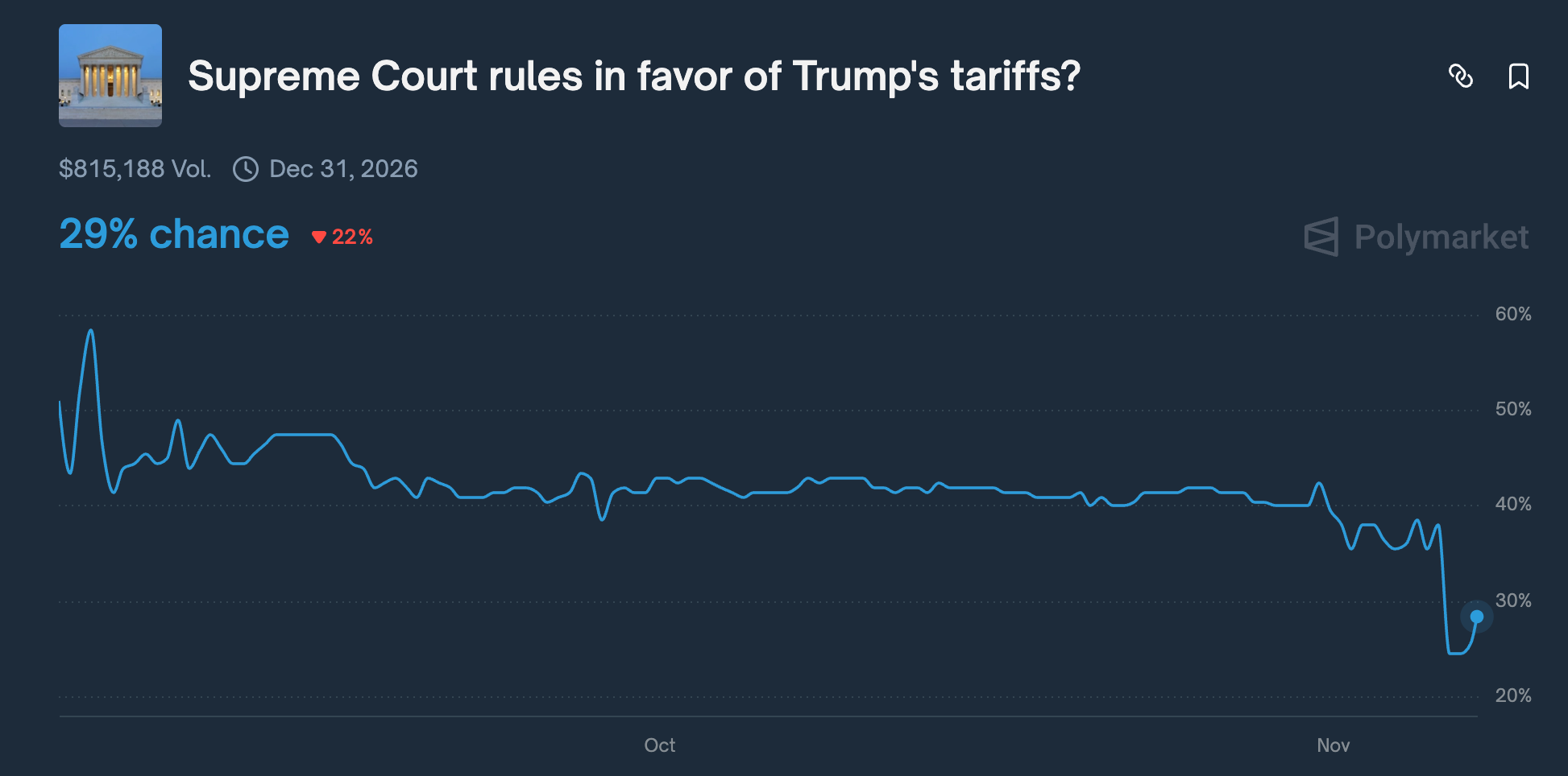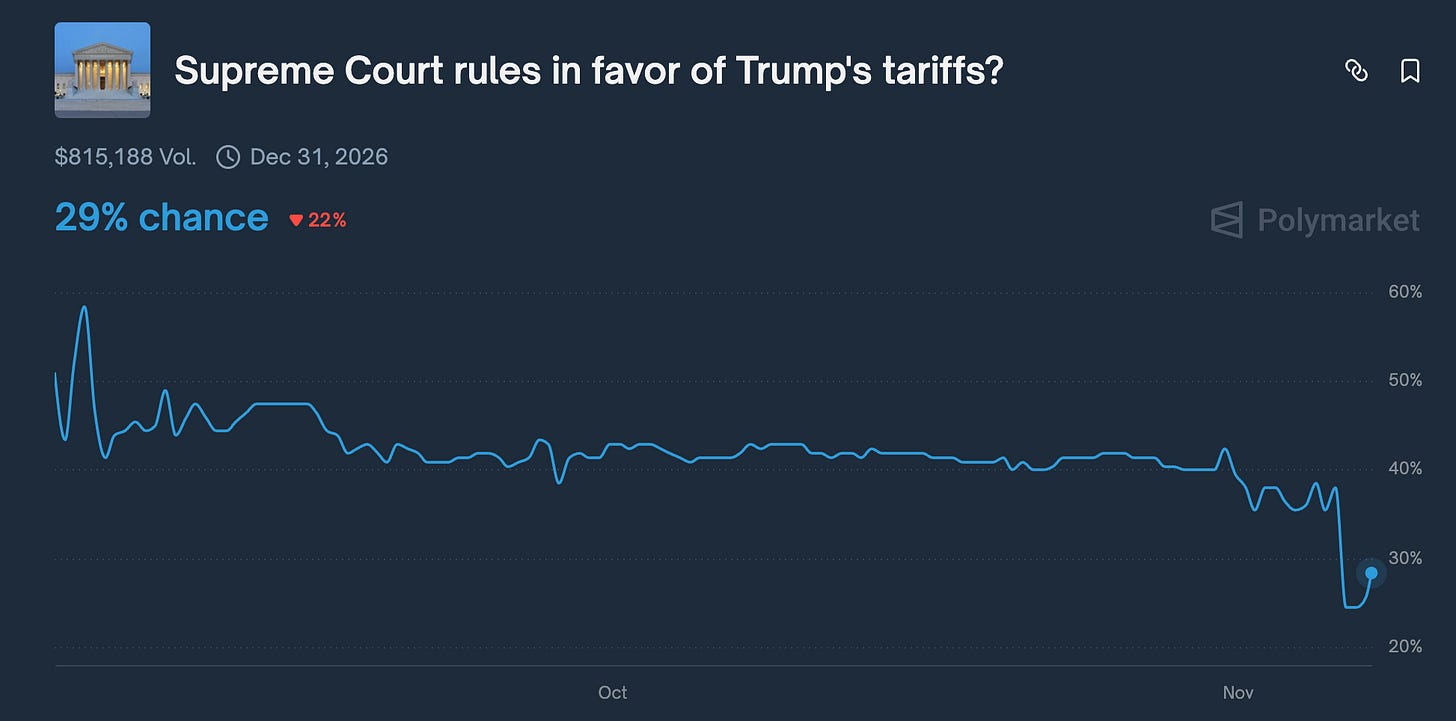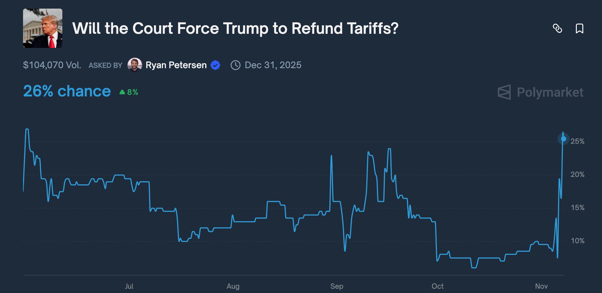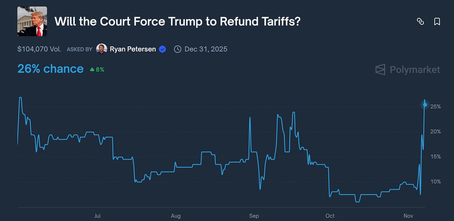 Jordan Schneider: There were two. I cannot believe PolyMarket hasn’t started sponsoring ChinaTalk yet. It’s actually a little offensive. The market was “Will the Supreme Court rule in favor of Trump’s tariffs?” It was at 40% when the debate started and is now sitting at 25%. Then there’s another market — “Will the court force Trump to refund the tariffs?” which started at about 8% and is now up to 16%.