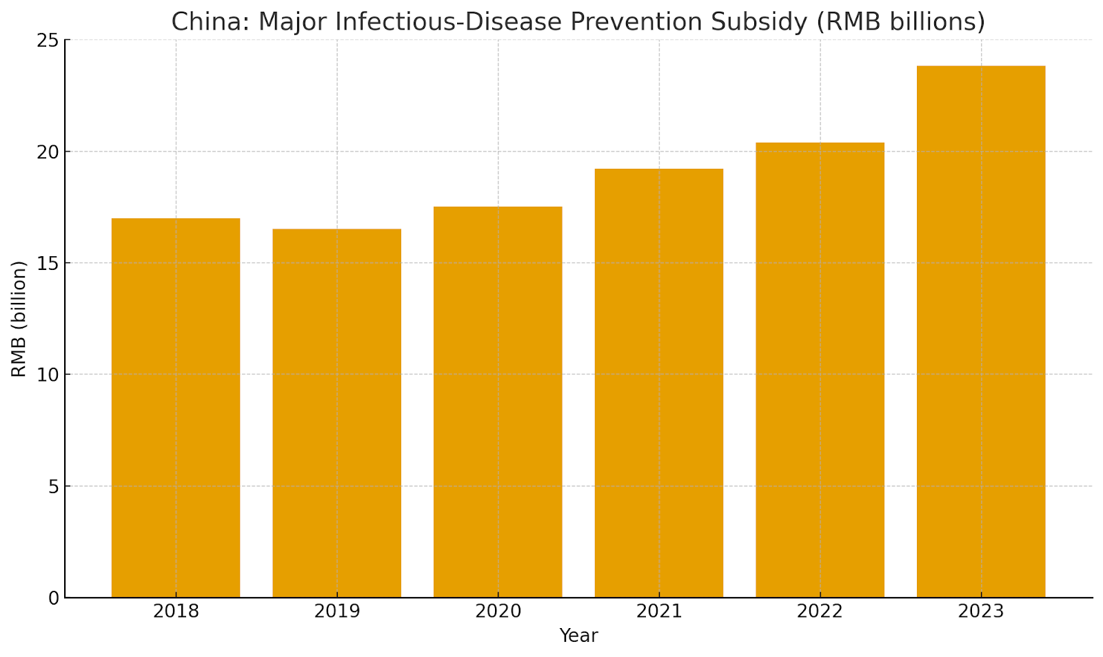 Our best piece of evidence comes from the Chinese Ministry of Finance, which shows that major infectious-disease prevention funding rose from about ¥16.98 billion ($2.38 billion) in 2018 to ¥23.82 billion ($3.34 billion) in 2023 — an increase of roughly 40% over five years. These funds are meant to expand things like vaccine-production capacity, surveillance systems, and hospital preparedness.