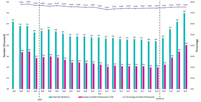 China CDC(中国疾控中心) — the technical core of the system. It collects and analyzes infectious disease data, runs testing labs, and provides guidance to local CDCs. The CDC workforce numbers surged during COVID, increasing by about 20% to reach 240,000 in 2022, the highest level ever. This was preceded by years of post-SARS neglect, which left the system understaffed and unprepared for COVID (see graph below).