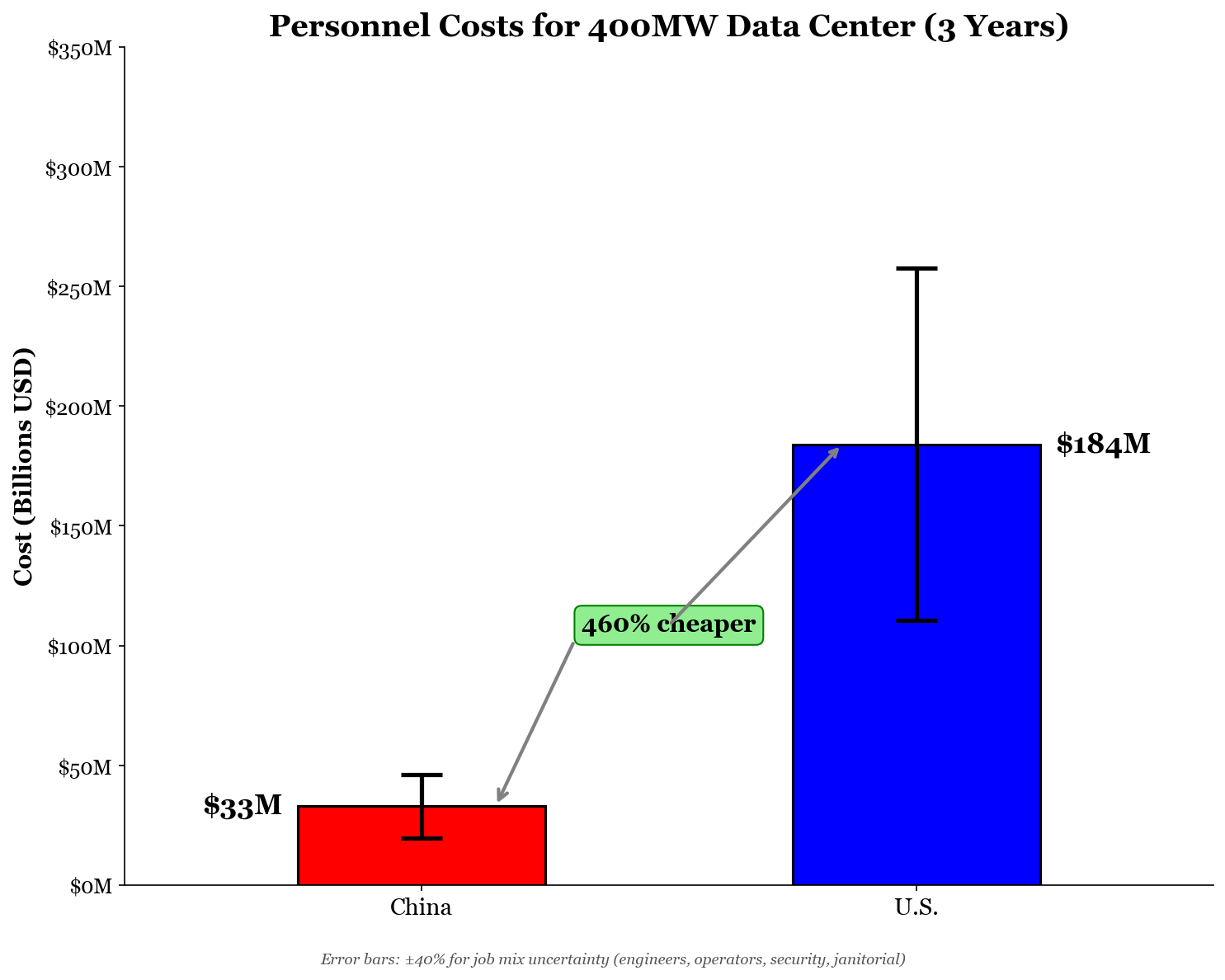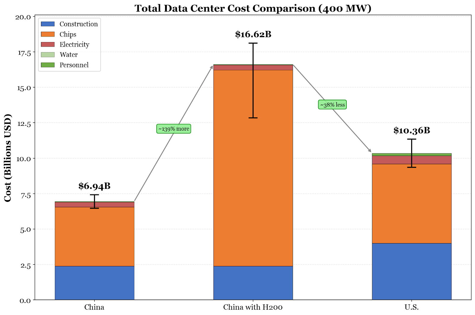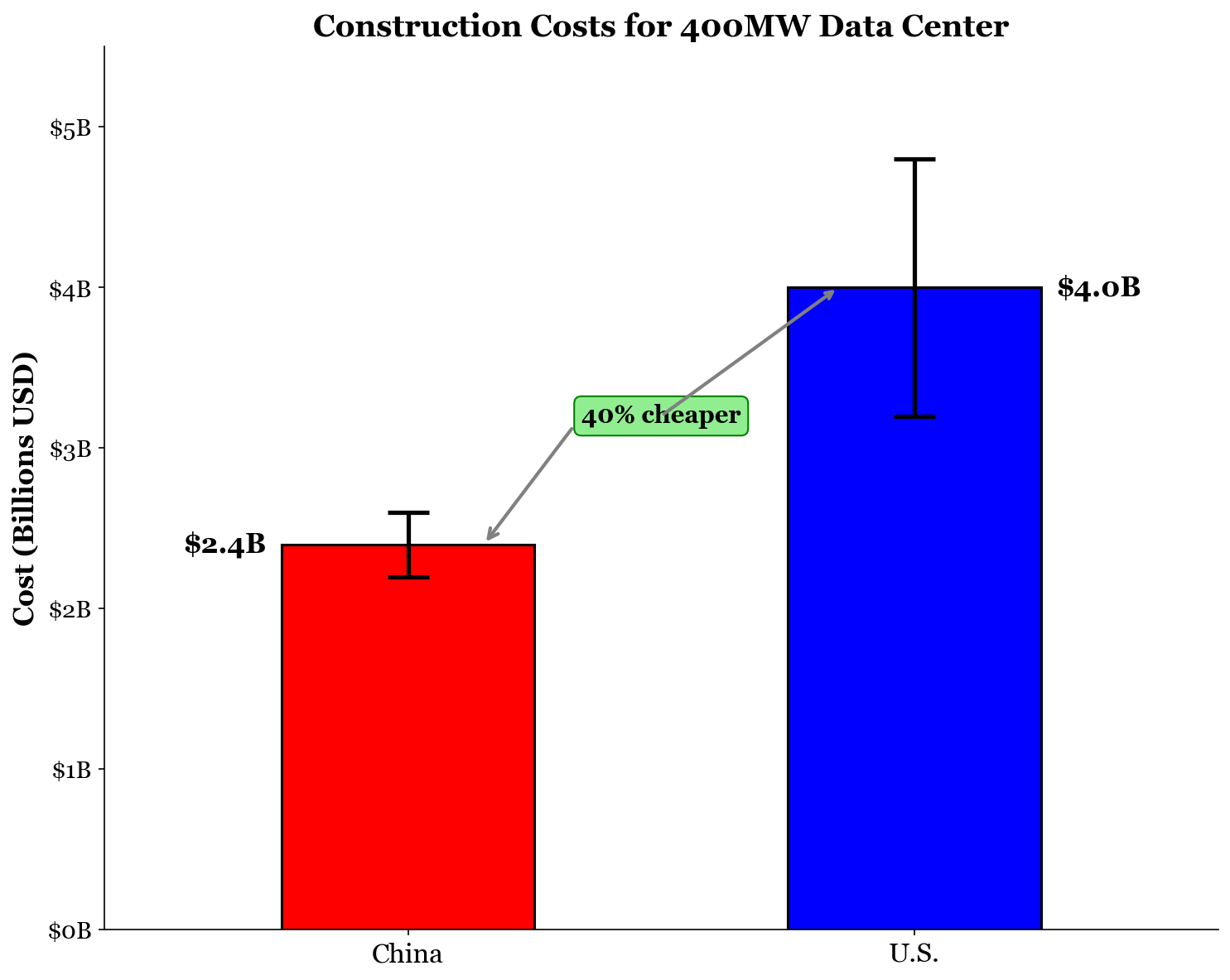 For a 400MW data center, then, construction in China would be about $2.4 billion, while in the U.S. it would be about $4 billion. That means construction alone would save China $1.6 billion.