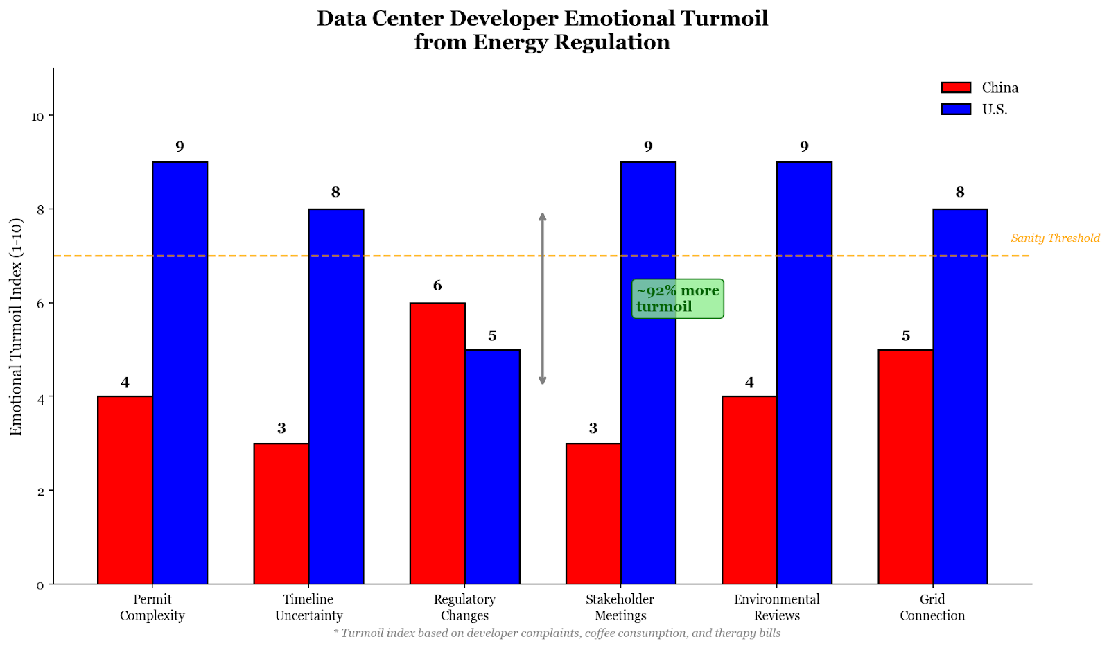 Besides financial burdens, data center developers also face other kinds of costs. A former White House staffer who worked on chips permitting said that this BOTEC needed a chart quantifying “developers’ emotional turmoil from engaging with U.S. energy regulation.” The gauntlet of energy regulations, permit processes, and construction timelines constitutes a serious challenge for the mental health of hyperscalers. After a deep analysis, Claude Code suggests that American developers face ~92% more emotional turmoil due to these regulations, consistently breaking the expected “sanity threshold” for such projects.