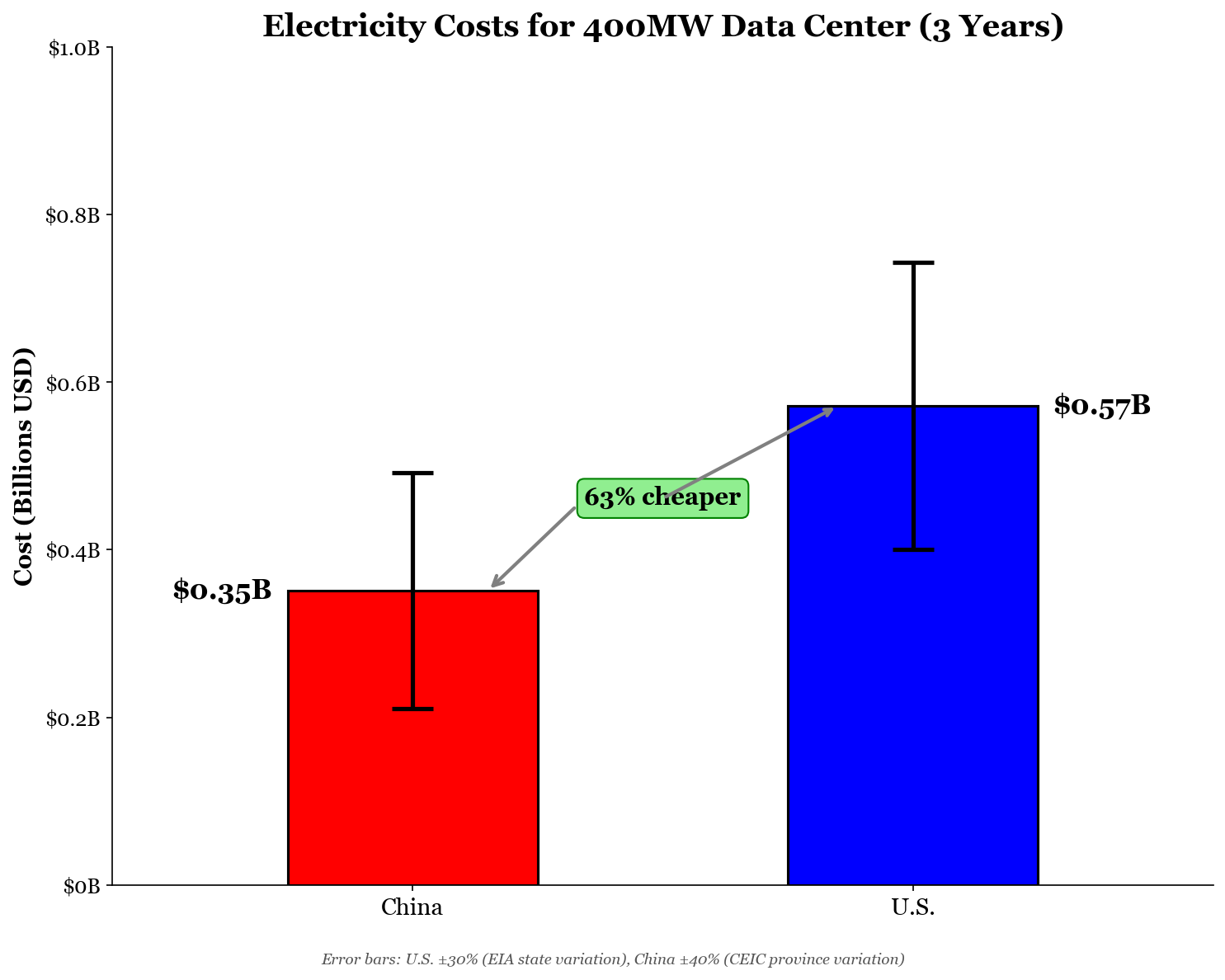 For powering a data center for three years, China’s massive electricity buildouts give it the edge. A kilowatt-hour (kWh) of electricity for industrial users, on average, costs about 9 cents in the U.S. while only 6 cents in China. In reality, these electricity costs are likely lower for both nations, as data centers tend to make deals to secure lower energy prices for large-scale projects. However, I will assume that the prices are relatively analogous.17