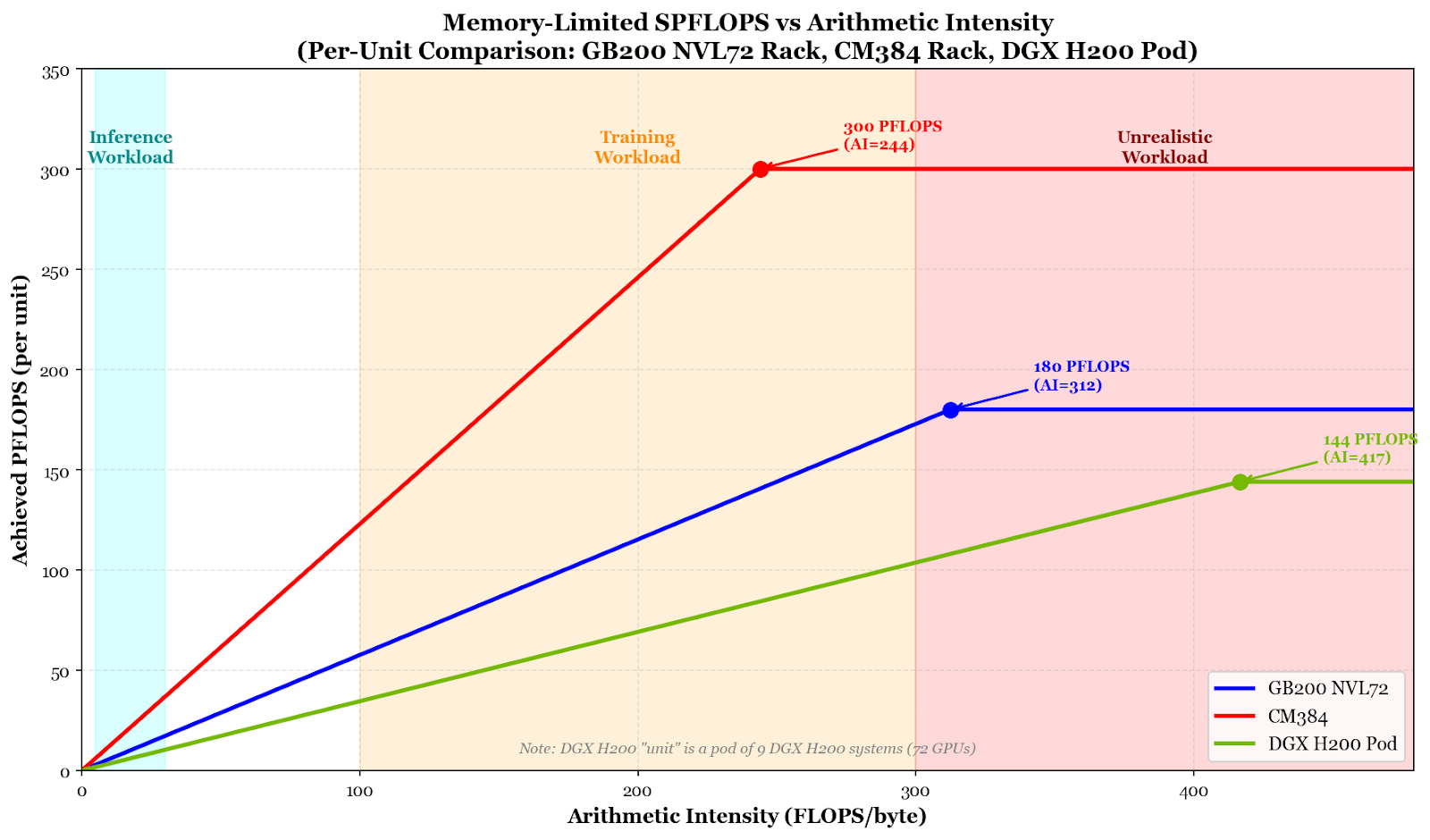 Although the number of H200s a Chinese data center would be able to accommodate lends an even greater number of peak FLOPS compared to the GB200 NVL72, the memory bandwidth of the DGX H200 is extremely constraining. The HBM bandwidth of the GB200 NVL72 and CloudMatrix384 is 576TB/s and 1,229 TB/s, respectively, whereas the DGX H200 pod would only have about 345.6TB/s.15 Thus, at an arithmetic intensity of 200 FLOPs per byte, no piece of hardware would reach its theoretical max performance, but instead cap out at the aforementioned SPFLOPS. An unrealistic sustained arithmetic intensity of 417 FLOPs per byte is required for the DGX H200 to reach its theoretical maximum, meaning that the GB200 NVL72 will reliably outperform it due to superior memory bandwidth.16