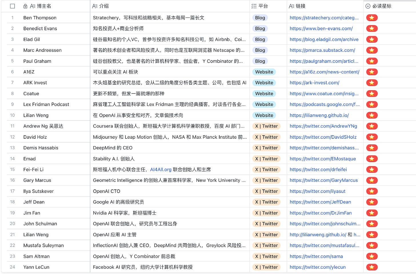 The section of “recommended foreign information outlets” has 129 sources, with 24 starred as must-read recommendations. Stratechery tops the list, while Lex edges out Dwarkesh. Most of the recommended sources have deep Silicon Valley associations, with one-third focusing on investment. The rest are C-suite executives or top researchers from big-name tech companies like OpenAI, Google, and Nvidia. Although some of the figures from big tech are AGI-focused, the list itself does not appear to be curated for AGI expertise. Rather, the even distribution of top profiles from big tech, mixed with prominent VC voices, reads more like a collection of Silicon Valley’s most commercially successful figures.