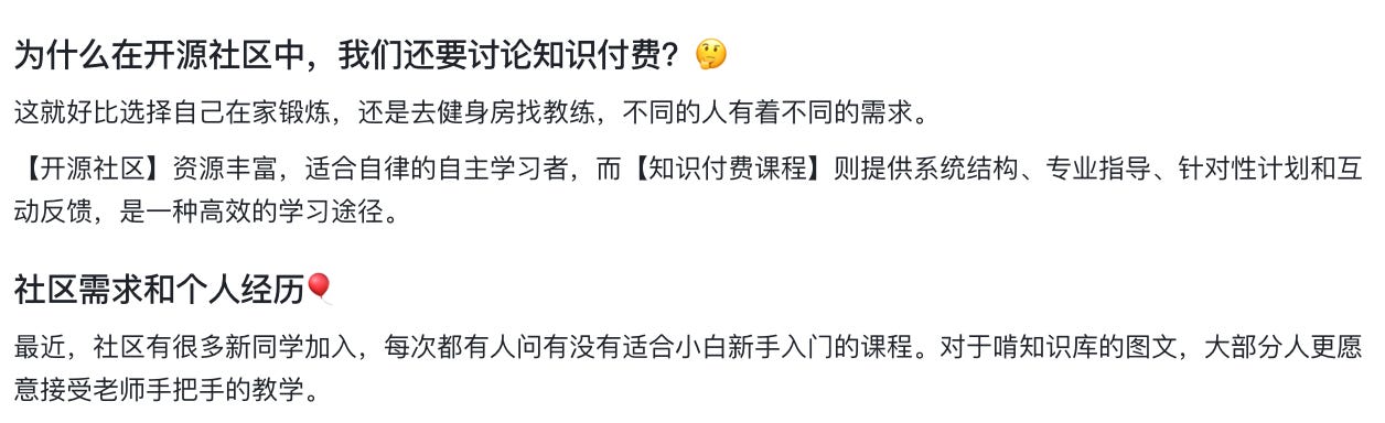 For example, in the AI Agent co-learning section, one member “shares” a piece of great paid content she “recently came across” (she is likely the person who runs the paid course). The screenshot below is how she justifies having paid for lessons (up to 5000 RMB/700 USD) in the open-source community: “It is like exercising in your home or going to the gym for guidance. Different people have different demands. The open-source community offers a wealth of resources suitable for disciplined self-learners. Recently, there have been many new entries to this community, and everyone is asking if there are suitable entry-level courses. Compared to learning from the text in the wiki, most people prefer the teachers to teach step-by-step.”