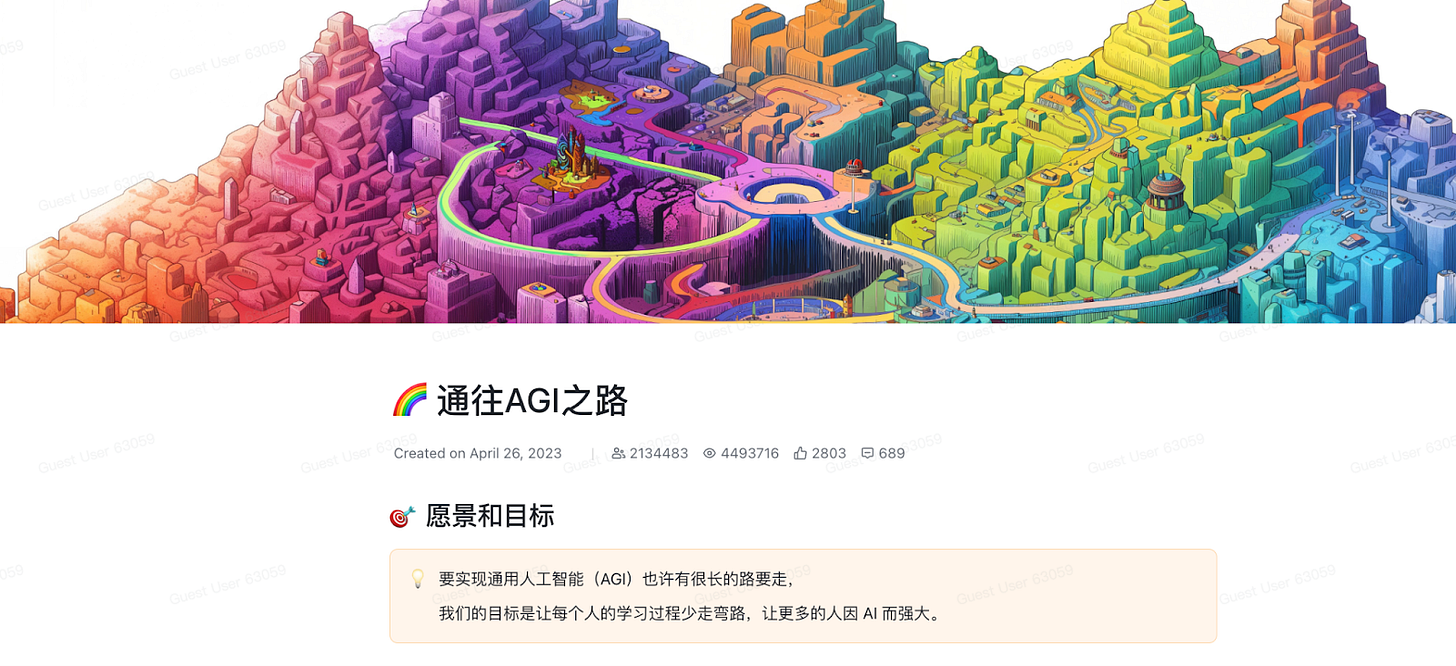Created in April 2023, the “Way to AGI” wiki is a collaborative knowledge hub hosted on the Bytedance-developed platform Feishu 飞书 (known internationally as Lark). It functions much like a shared giant Notion workspace — users can upload documents,1 create events, and leave comments on each other’s posts.