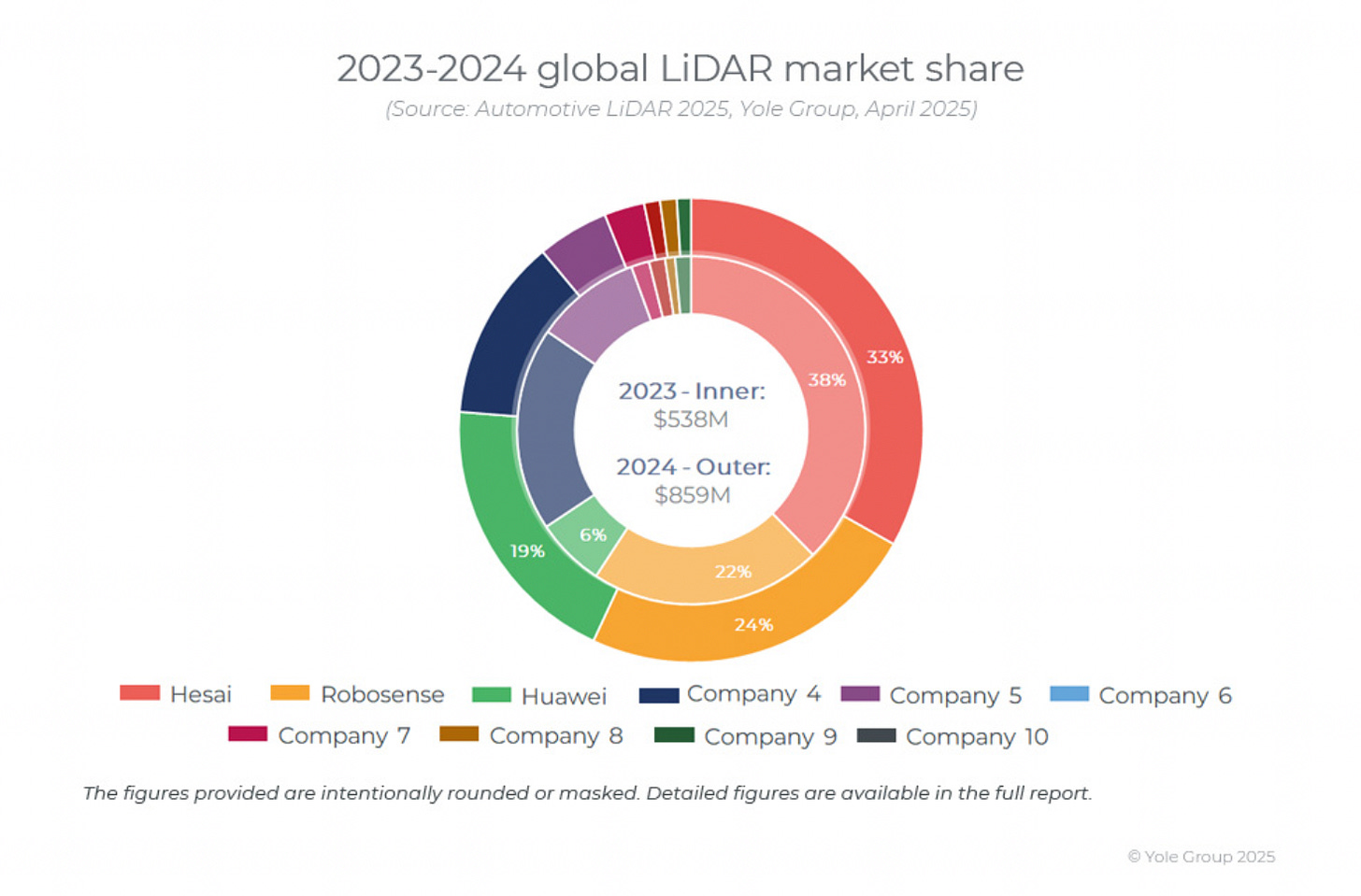 LiDAR uses laser pulses to create detailed 3D maps of a vehicle’s surroundings, measuring distances to objects. It’s the spinning sensor thingy typically mounted on top of autonomous vehicles. China controls ~90% of the global LiDAR market. Firms like Hesai, RoboSense, Huawei, and Seyond account for the bulk of automotive-grade LiDAR shipments.