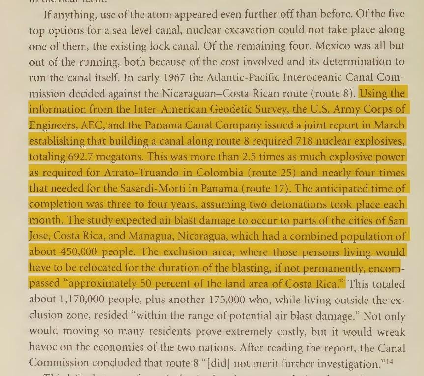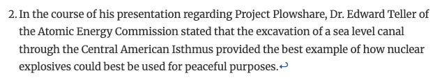 The guy behind it was Edward Teller, father of the hydrogen bomb and Princeton man (before that meant woke).1 The Atlantic-Pacific Interoceanic Canal Study Commission spent years planning to nuke a sea-level canal through Colombia. They were “confident that someday nuclear explosions will be used in a wide variety of massive earth-moving projects,” but some hippies got worried about radiated milk and killed their momentum. The time to cash in on Teller’s vision is now.