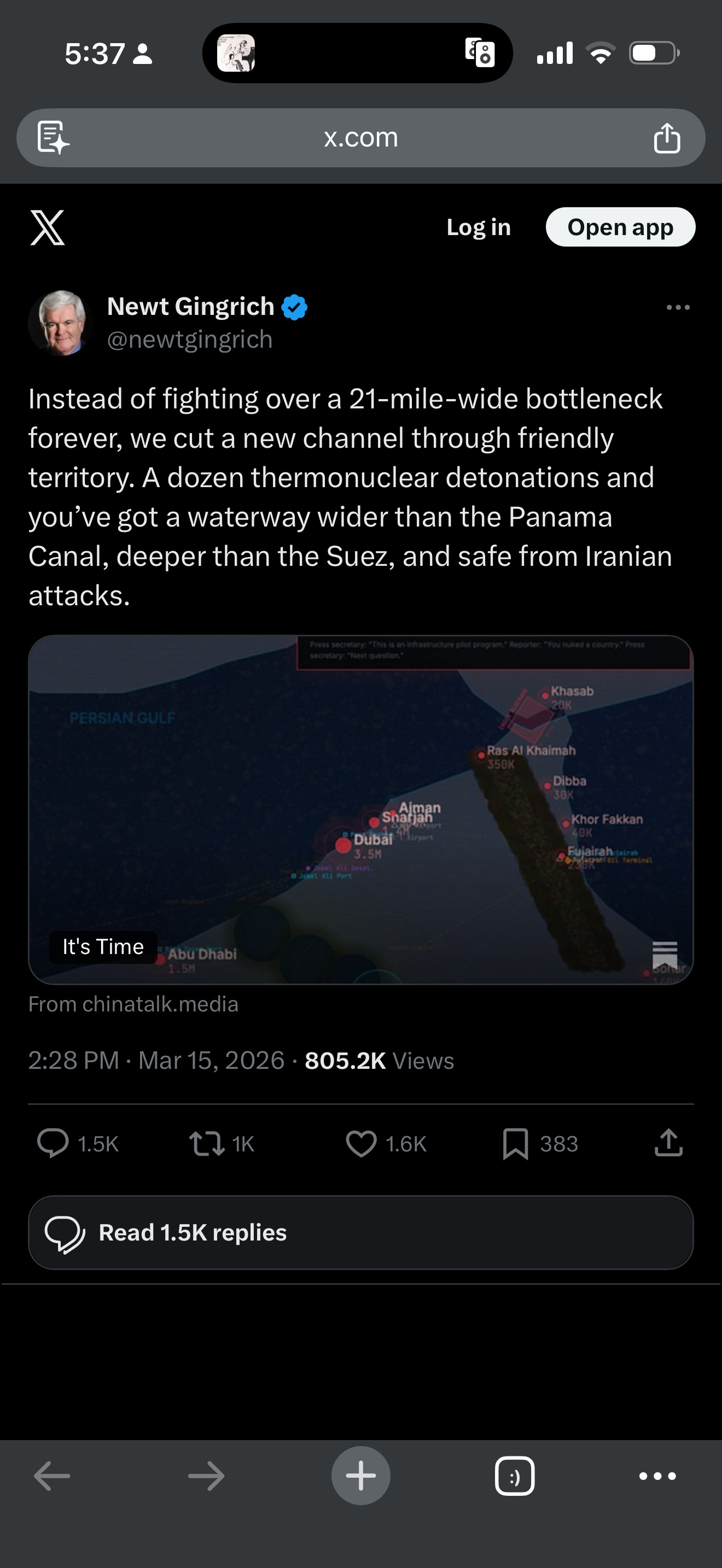 Instead of fighting over a 21-mile-wide bottleneck forever, we cut a new channel through friendly territory. A dozen thermonuclear detonations and you’ve got a waterway wider than the Panama Canal, deeper than the Suez, and safe from Iranian attacks.2