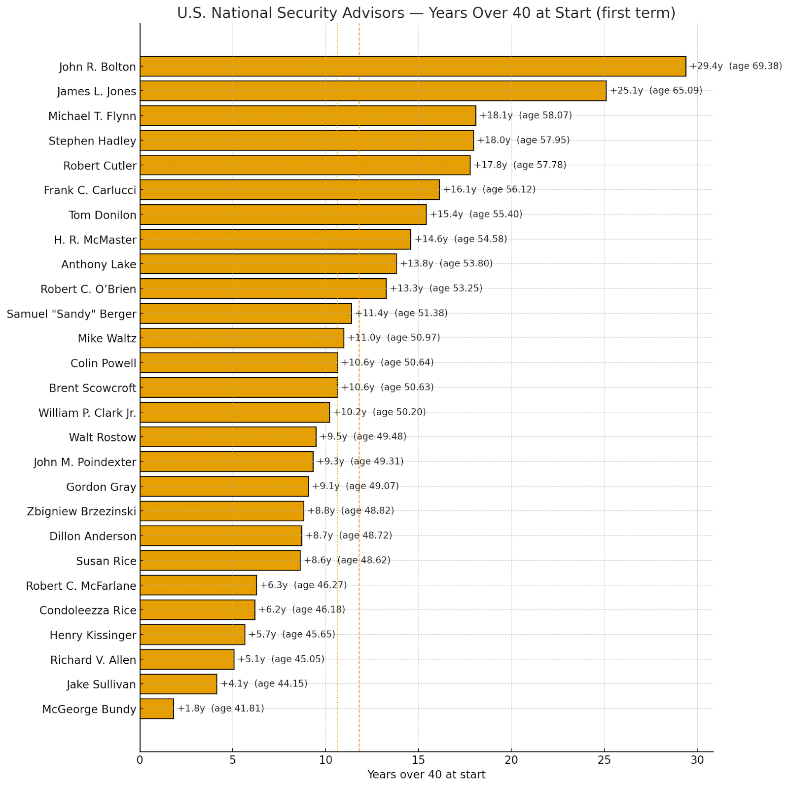Pluses of being on the younger side include energy, stamina, the capacity to really dig in and do the job full bore, full scale, 24/7. Being willing to push the envelope and be creative and dynamic and say we’re going to do things a different way, we’re going to have a theory of the case and try to execute against it — that youthful vision, energy, and creativity matters. That’s not just the single person acting as National Security Advisor — it’s also the team they build and the dynamic they build.