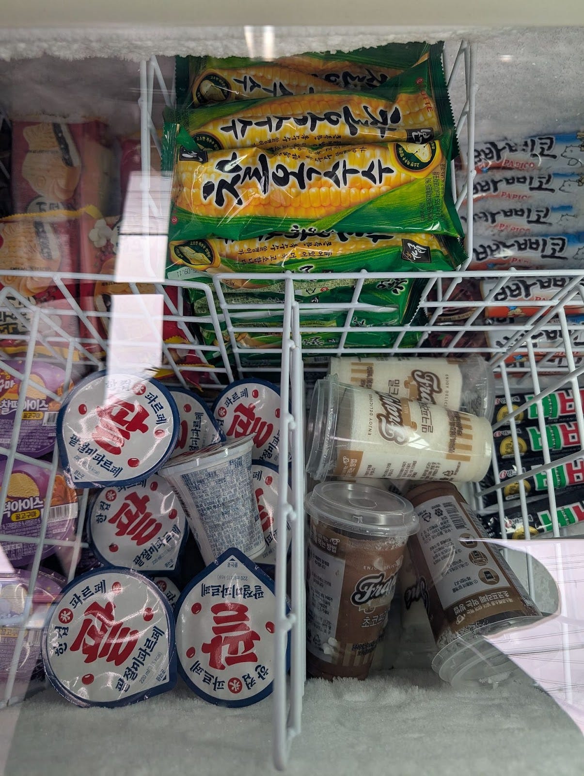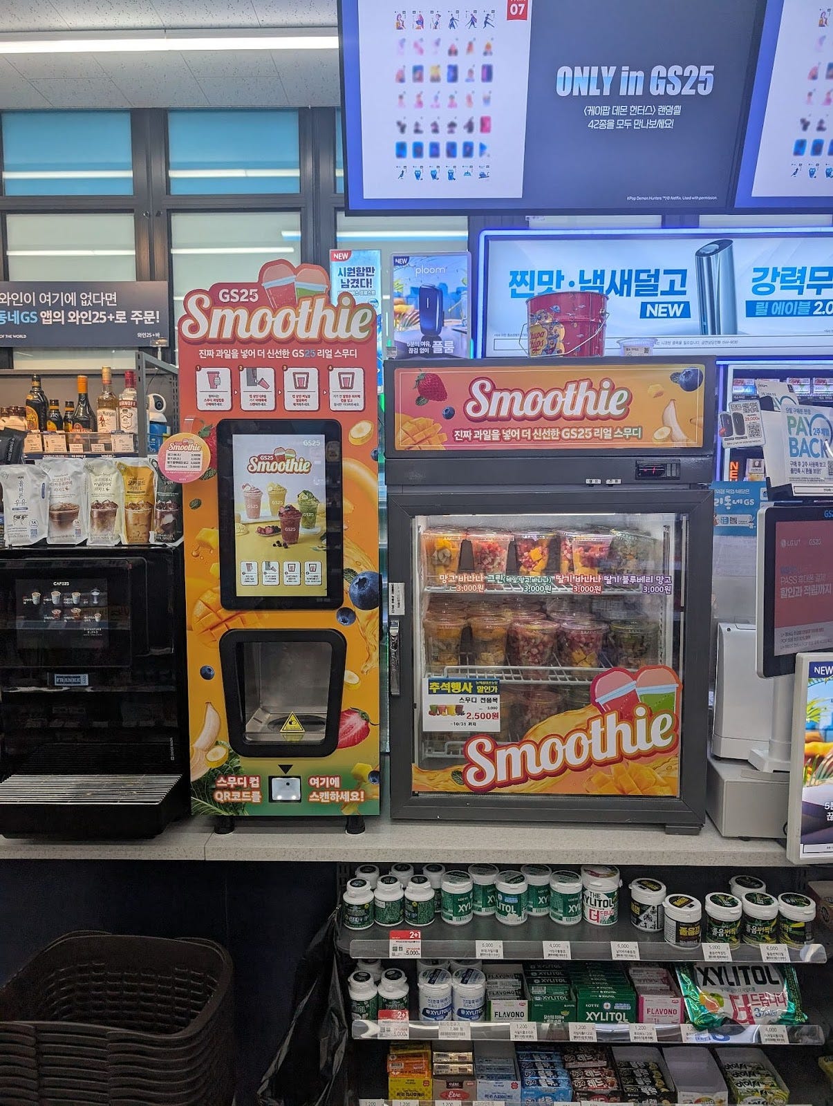 Korean convenience stores have wonderful smoothie machines. For 3,000 KRW (US$2.10), you can pick out a cup of frozen fruit and have it blended in front of you. Be sure to purchase your fruit cup before you blend it to avoid violating smoothie procedure.