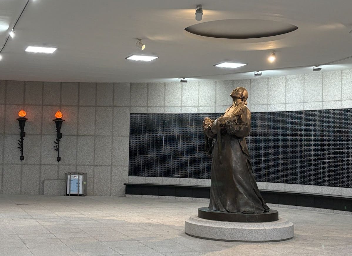 The “gwang”/광 in Gwangju corresponds to the Chinese character 光, which means light; Gwangju, then, is the Land of Light. I’ve never been to a city with as many commemorative statues as Gwangju. There is an entire park dedicated to statues in the western part of the main city, the government having commissioned artists to explore and immortalize the city’s history. A walk through the park crescendos with a large metal depiction of three students, their arms reaching forward and their faces bearing solemn expressions in a surprisingly socialist-realist style. Under their bodies is an entrance to an underground chamber, in which the names of all known victims surround another statue, this one of a mother holding the body of an agonizingly young teen — a modern Korean Pietà.