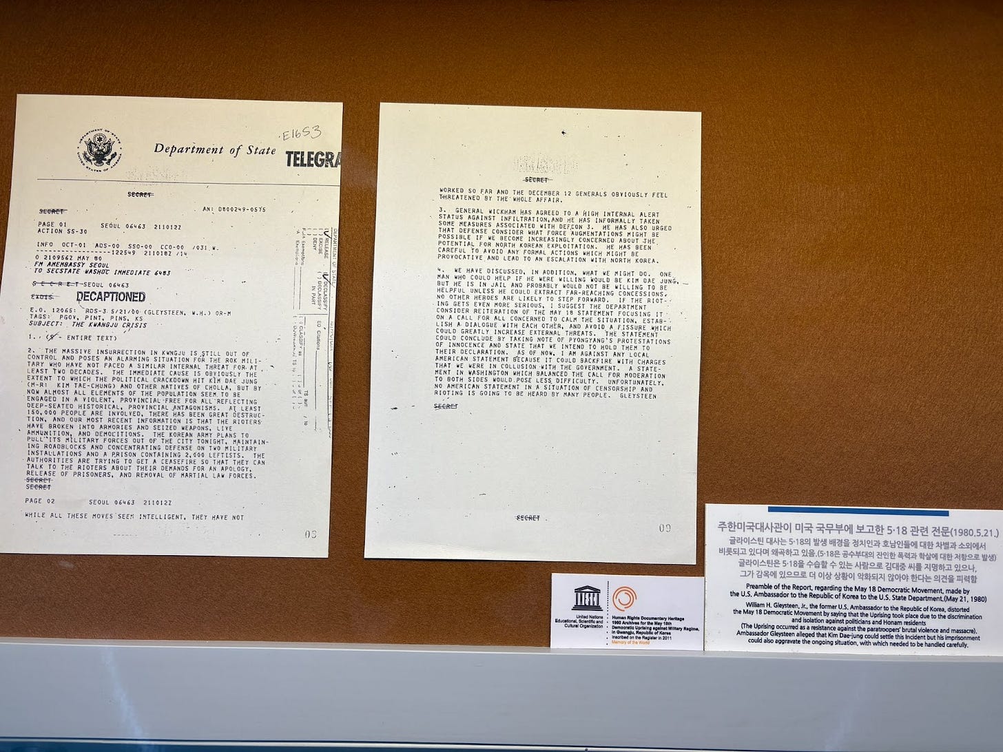 Gwangju is not just expressive about its past; it is passionately, thoroughly meticulous. The Jeonil Building, one of the city’s most iconic structures, has been renamed Jeonil 245 after the 245 bullet traces found on its top floors. The directions and depths of each trace conclusively prove that paratroopers shot at people from helicopters, a fact often disputed by those seeking to minimize the extent of cruelty inflicted on Gwangju’s people. Jeonil 245 contains an entire exhibition dedicated to repudiating false claims about Gwangju, including the oft-repeated far-right conspiracy that North Korea instigated the uprising. The nearby 518 Archives is a ten-floor building that houses documents about the events of May 1980. The top floor allows visitors to watch traffic underneath from the exact same windows where Catholic clergymen watched the military brutalize young students marching from Chonnam University. Some of those clergymen would later stage hunger strikes for democracy and clemency for protestors throughout the 1980s. The Old South Jeolla Provincial Hall, where resistance forces staged their last desperate fight, is currently being restored. Every single exhibit I went to was free to enter and had decent-to-excellent English signage.