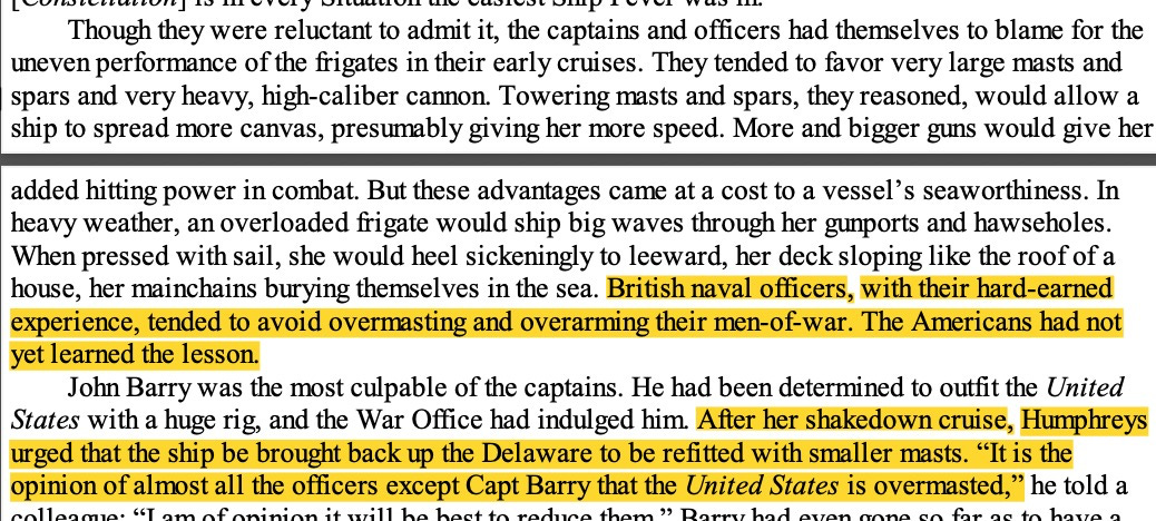 Instead of centralizing production, the US farmed out their manufacture to six shipyards to gain more support for the Navy. Some states went overboard. Everyone wants giant masts and giant guns until you actually have to sail with them.