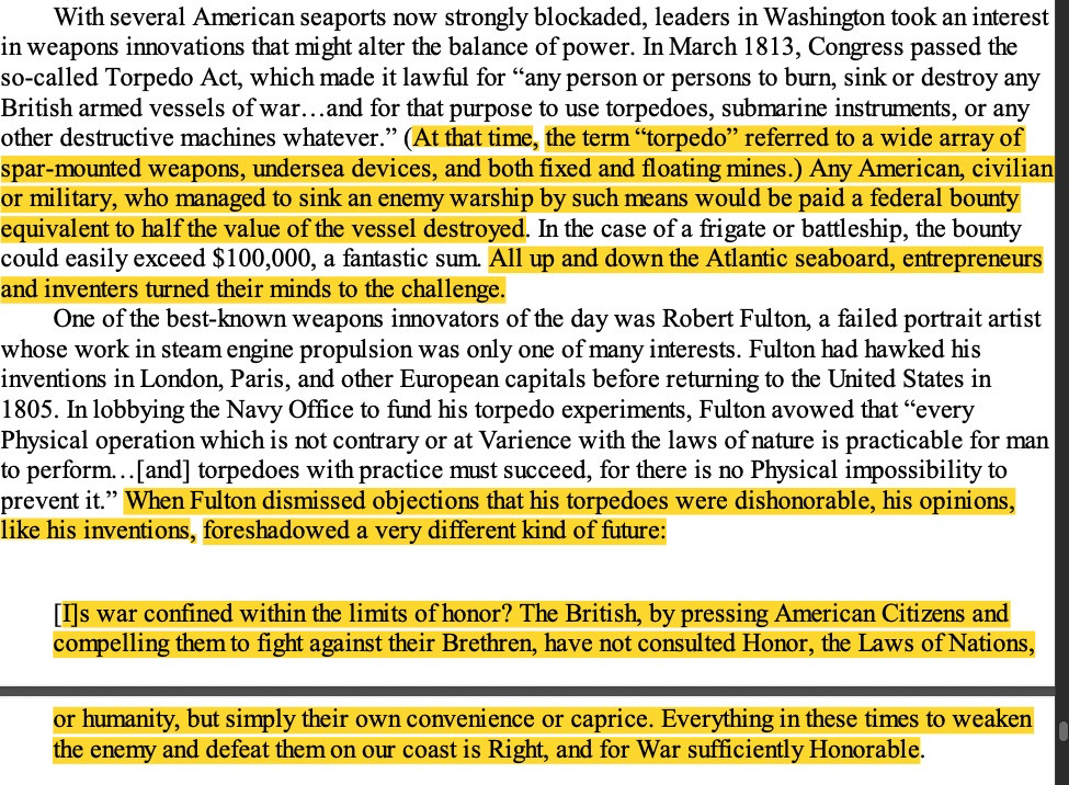 Oh and we even got some torpedoes and undersea mines that the Brits during the War of 1812. The established powers though thought they were dishonorable (because anything that challenges what works well for you always is).