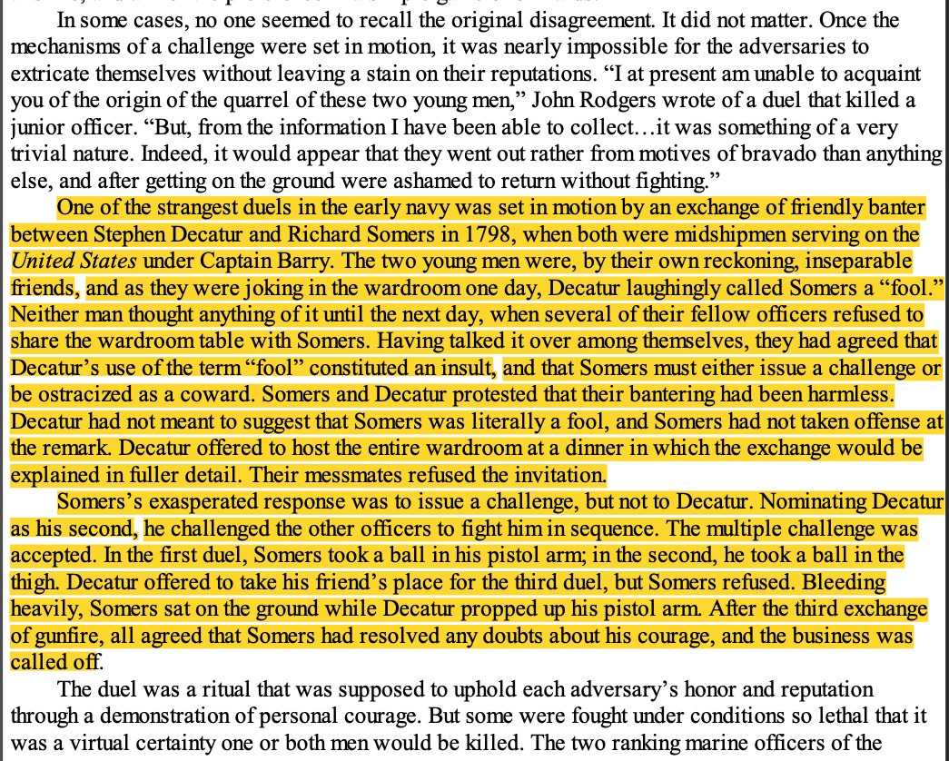 Dueling between bored adolescent Navy officers was a big deal. “The most trivial disagreement was liable to trigger a challenge. One midshipman was offended when another entered the wardroom wearing a hat. Another challenged a messmate because the offender had spilled some water on a letter he was writing. A pair of midshipmen nearly dueled after arguing whether a bottle was green or black.” But here is perhaps the dumbest one in history, involving legendary Stephen Decatur.