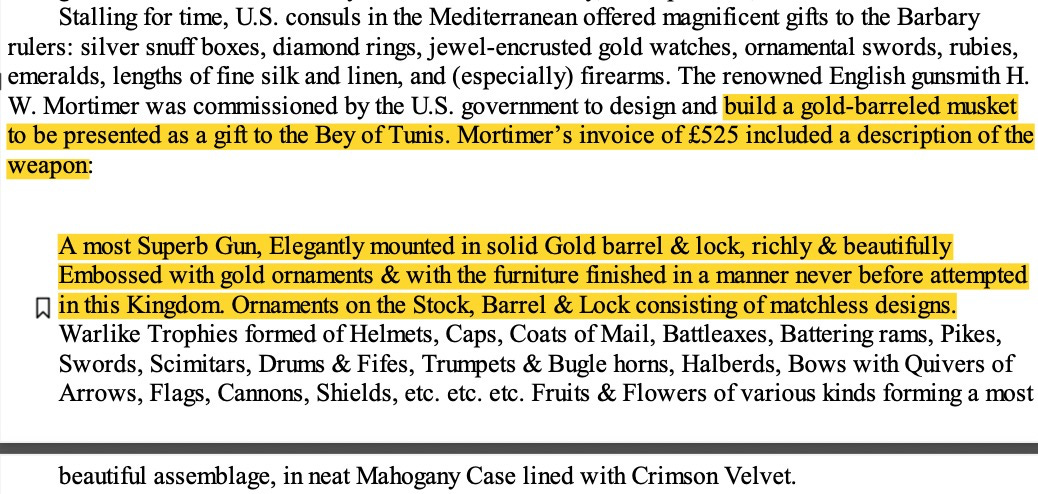Once the Algerians decided they weren’t getting paid enough tribute and hijacked an American boat, “Vessels bound for the Straits of Gibraltar could not be manned at any rate of pay. Maritime insurance premiums doubled and then tripled, U.S. government bond prices collapsed, and merchant houses were bankrupted.”
