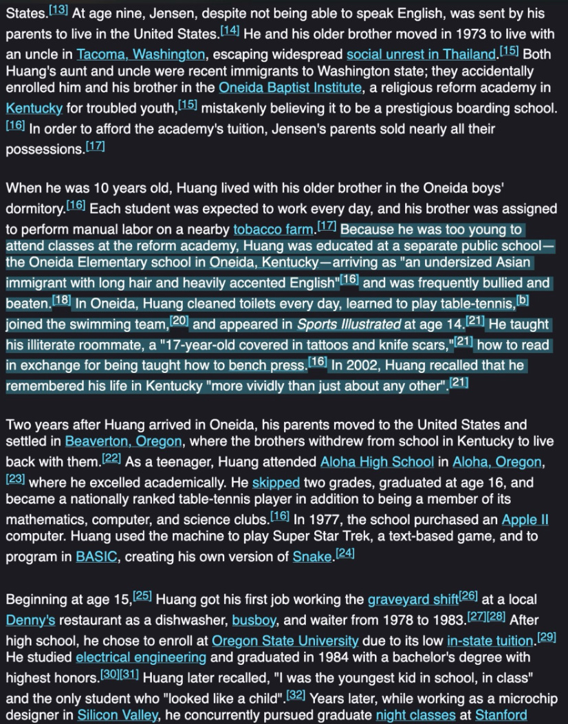 Jensen is the gangsta poster boy for American Dream. He is REALLY is Not a Loser. He’s also not a Car, but indeed is the driver. Moreover, there are almost no people alive with a greater dynamic range of lived experience, who have gone from positions many would die to escape and into a position entire institutions fight to death over, and only tightened their grip since. Xi Jinping would qualify as a peer, maybe? (Musk has less range, even though he ended up in a similar place.) These individuals are fascinating outliers, and I believe that when they deign to explain their ways, however awkwardly, us mortals should sit our asses down, listen and learn.