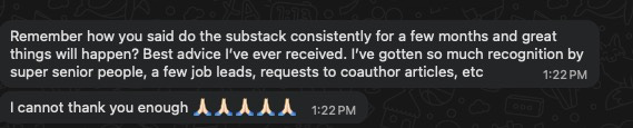 Writing in public is how you will meet people interested in you in your field. It will generate interview requests from mainstream press and inbound from decisionmakers who are curious about your takes. Insofar as ideas matter, which they do (politicians and their staff do things not because a randomizer tells them to…), substack posts are the most efficient venue for early career folks to make a name for themselves and make an impact.