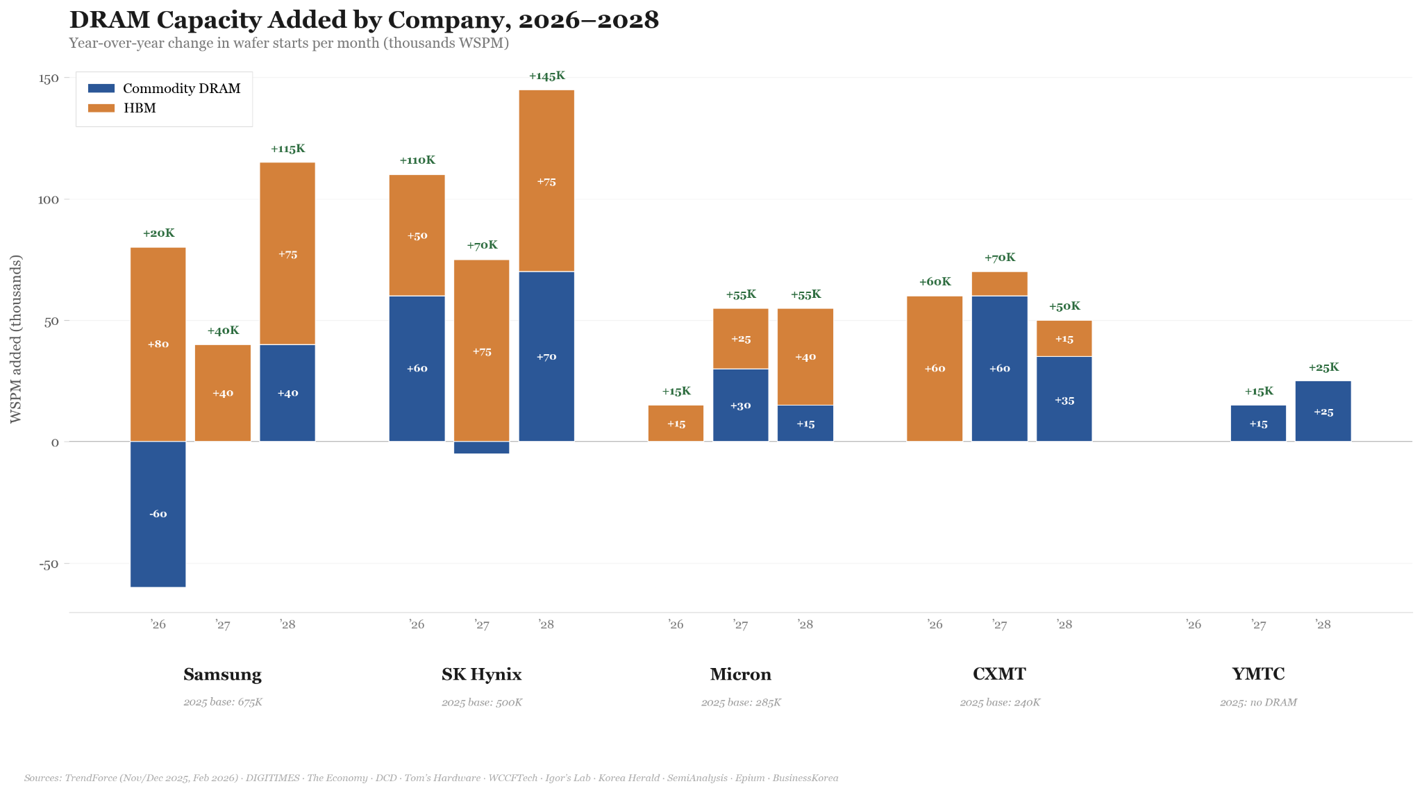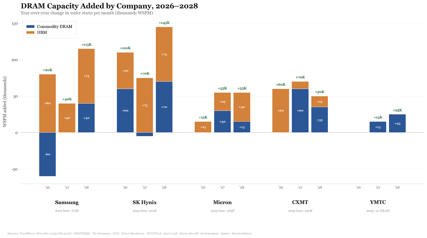It is worth noting that the Big Three’s capacity allocation and expansion can play out in one of two ways: either they largely stick to their planned HBM roadmap, or they pivot to shift more allocation toward commodity DRAM. In the former situation, CXMT plays a helpful role moderating the market, pacifying the consumer economy until the Big Three have enough capacity in 2028. This scenario opens up greater risks of market dependency, which are explored in the case against Chinese memory below.