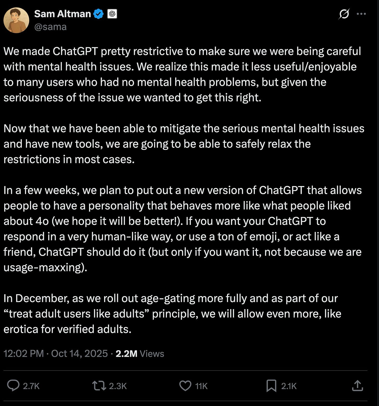 Western companies have fewer compulsions around sexing up their products. We’ve seen Elon’s X.AI ship a sexualized AI girlfriend. While OpenAI is turning down dials on dependency after the recent spate of suicide reporting, OpenAI’s February 2025 model card update did not prohibit sexualized content for all use cases besides sexualizing minors. The two heaviest global hitters in the NSFW AI companion space are American with Janitor.AI at 100m MAU Canadian with SpicyChat.ai at 50m.