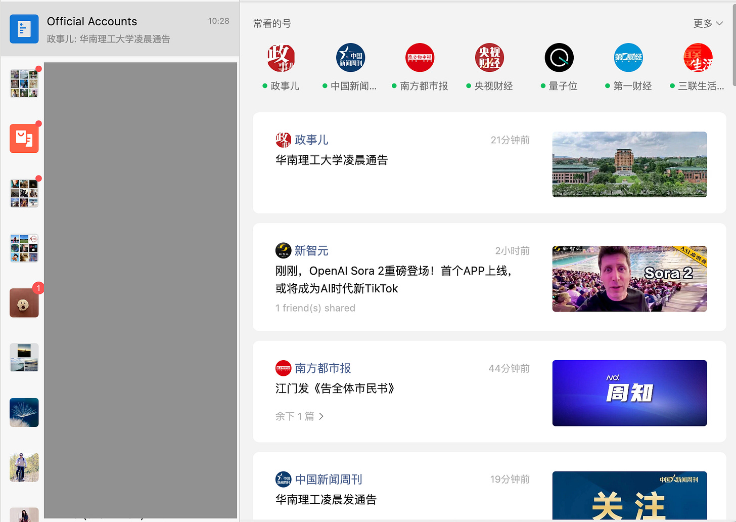Specifically relevant for our purposes is the “Official Accounts” tab. It’s a little like a Substack ecosystem inside WeChat: anyone can open an Official Account on WeChat and publish articles to their subscribers’ feeds — and reading and sharing Official Account articles is a daily occurrence for WeChat users. Government organs, public service authorities, news media (both state-run and independent), and corporations alike use Official Accounts to communicate with citizens.