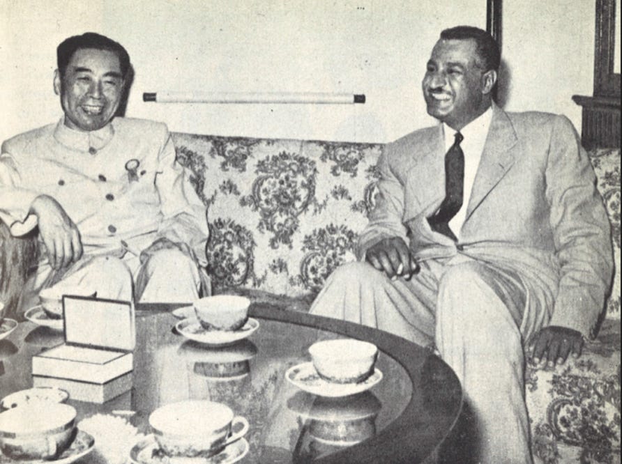 The conference presented an opportunity for China to circumvent American containment — by 1955, American troops were in Taiwan, Korea, Japan, Vietnam, and the Philippines. Forging international alliances was a useful tool for gaining recognition at the United Nations. Here, Zhou Enlai bonded with Nasser over their shared goal of Palestinian statehood, which led to the recognition of the PRC by the Arab world not long after. The PRC compared Palestine and China as two places with a common struggle against American imperialism. Like how the PRC claimed Taiwan as historically belonging to China, so too with Palestine and Israel. The PRC viewed Taiwan and Israel as agents of American imperialism. Portraying the Israeli state and Zionism as one facet of American imperialism paired with support for Palestinian freedom allowed China to build solidarity with Palestine and, on a larger scale, with the Arab world.
