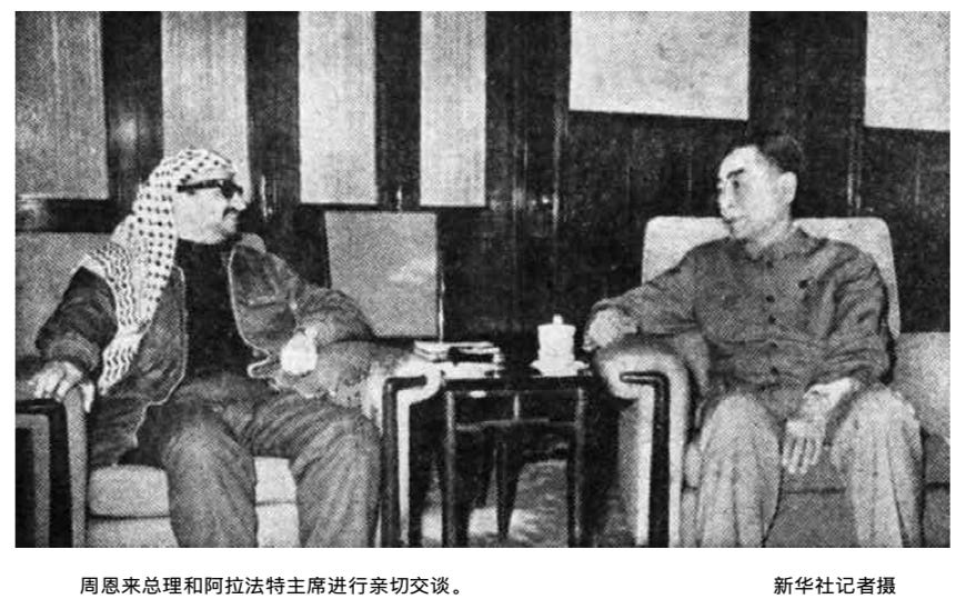 Arafat’s meeting with Zhou Enlai on his penultimate day in China was perhaps the culmination of his visit. Despite little news coverage of the conversation, the talk was “cordial” (亲切).11