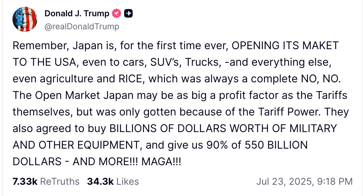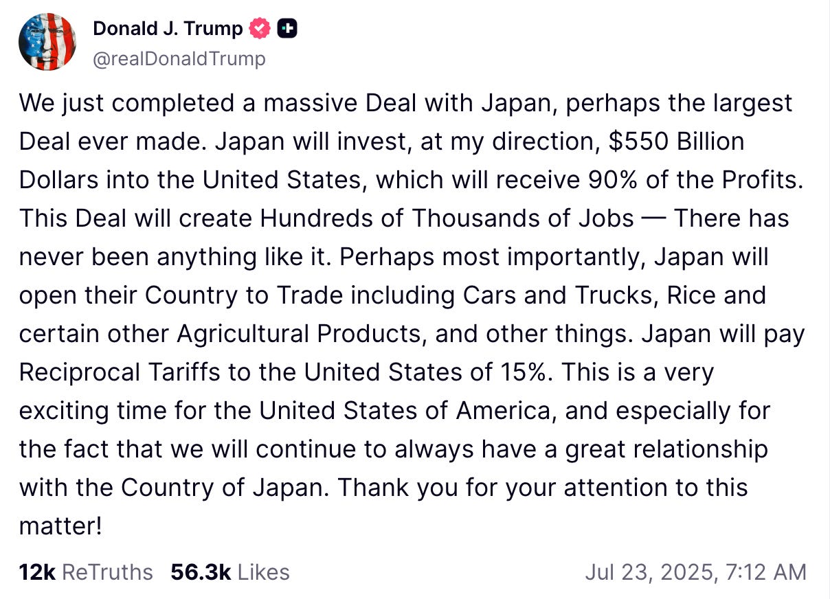 Tobias Harris: Well, the first thing that happened after we recorded was that a US-Japan trade deal was announced via a Truth Social post by the president. Everyone was wondering if we were going to get that deal, and then we did. At first, it looked like it was going to be an entirely one-sided deal, but then details started trickling out. It’s actually probably about as good a deal as Japan could have hoped for.