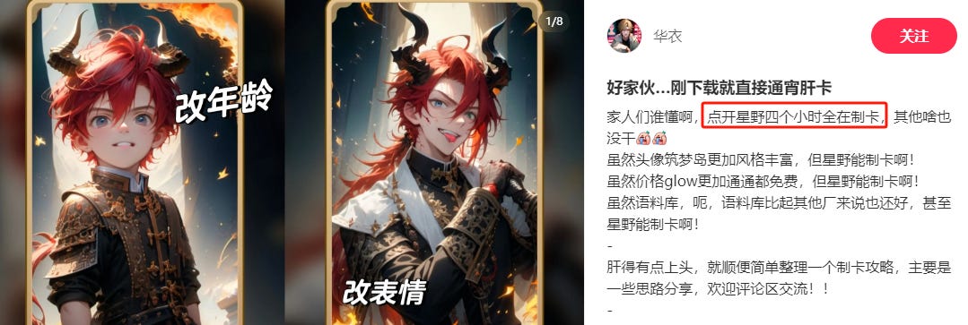 These AI companion products also draw insights from existing popular gaming cultures in China, such as card-drawing games that already have million-dollar markets. For example, Xingye allows users to generate 18 cartoon cards for one fictional character, adapting Japan’s popular gacha game mechanics and trading card culture for AI companions. In gacha games, players pay to randomly draw digital cards or characters, with rare editions commanding premium value. Chinese livestreamers have imported this model, streaming card draws on social media while viewers pay to test their luck for limited-edition collectibles tied to major intellectual properties. Similar to gacha games, AI-generated cards add an element of mystery and excitement when revealed. Users can also create and trade AI character photos on the platform, mimicking real-world card-collecting transactions.