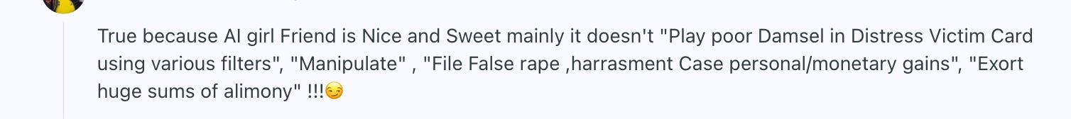 A recent Reuters-covered report from an AI girlfriend platform further supports our findings: 50% of young men prefer dating AI partners due to fear of rejection, and 31% of U.S. men aged 18–30 already chat with AI girlfriends. Behind the fear of human rejection lies the manosphere. The “manosphere” is a network of online forums, influencers, and subcultures centered on men’s issues, which has become increasingly popular among young men and boys as their go-to place for advice on approaching intimacy. While the manosphere originated primarily in Western contexts, its discourses have increasingly spread to, and been adapted within, countries across Africa and Asia through social media. In these online spaces, frustrations over dating and shifting gender norms are common, often coupled with narratives portraying women as unreliable or rejecting. AI companions offer a controllable, judgment-free alternative to real-life relationships, aligning with manosphere ideals of feminine compliance and emotional availability. On the subreddit r/MensRights (374k members), users largely endorse the findings of the Reuters report and even celebrate the shift from human to AI relationships.