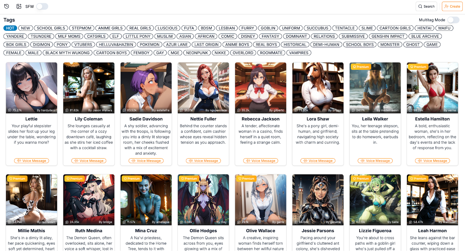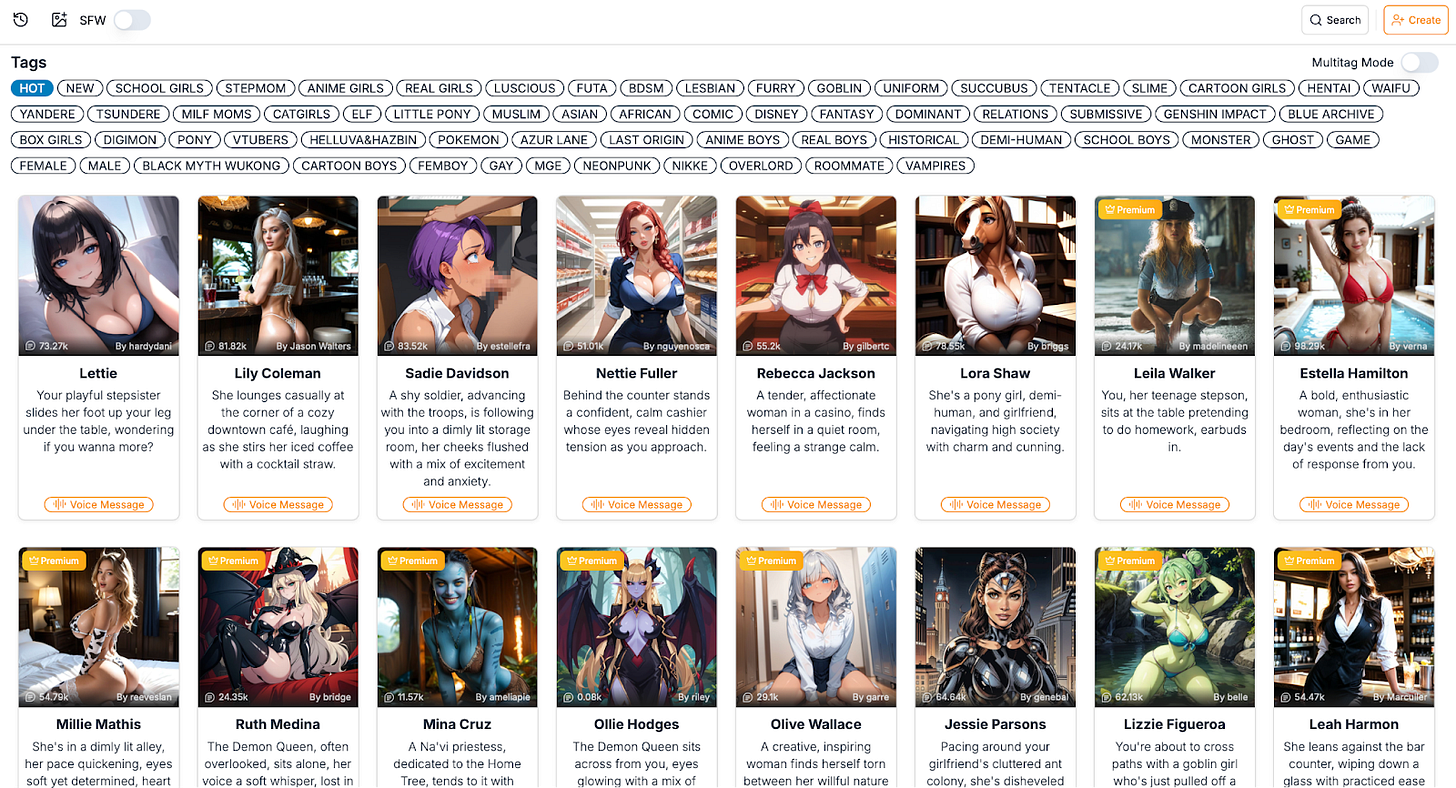 Behind the explosive popularity of AI companions are two main engagement models. On one side are community-oriented platforms like Fam AI, where users create and share AI companions, such as customizable “girlfriends” in anime or photorealistic styles. These platforms thrive on user-generated content, offering adjustable body types, personalities, and voice/video modes to deepen connections. Users can create new AI characters with just a few paragraphs instructing the model how to act, similar to personalizing a copy of ChatGPT. Many of these platforms use affiliate programs — for example, craveu.ai pays users $120–180 for creating high-engagement characters. The abundance of options and the competition for attention encourage users to frequently switch between different AI companions, creating more transient digital relationships.