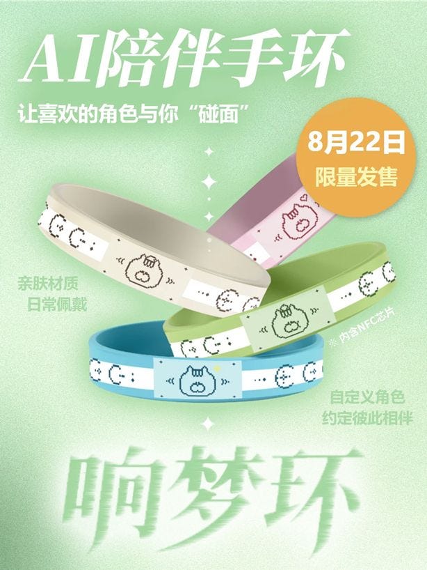 Other AI companion companies also leverage users’ existing social behaviors. For instance, Duxiang’s AI WeChat Friend Circle allows AI partners to actively post on social media and interact with both users and other AI characters, mimicking real Chinese social media patterns. The company has even developed a wristband with Near-Field Communication (NFC) chips2 that connects to specific AI characters. When tapped on a phone, the AI character will appear on the screen to provide updates or show care, which builds physical connection in existing digital relationships.
