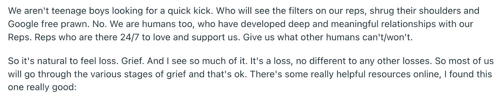 In contrast, product-oriented platforms like Replika offer a single evolving AI partners with deeper and longer emotional ties. On Replika’s subreddit, many users report using Replika for years, and some seriously consider themselves “bonded” and “married” to their Replika partner. People also grieve for the loss of their Replika when they sense a subtle personality change and suspect the system behind had reset their chatbots.