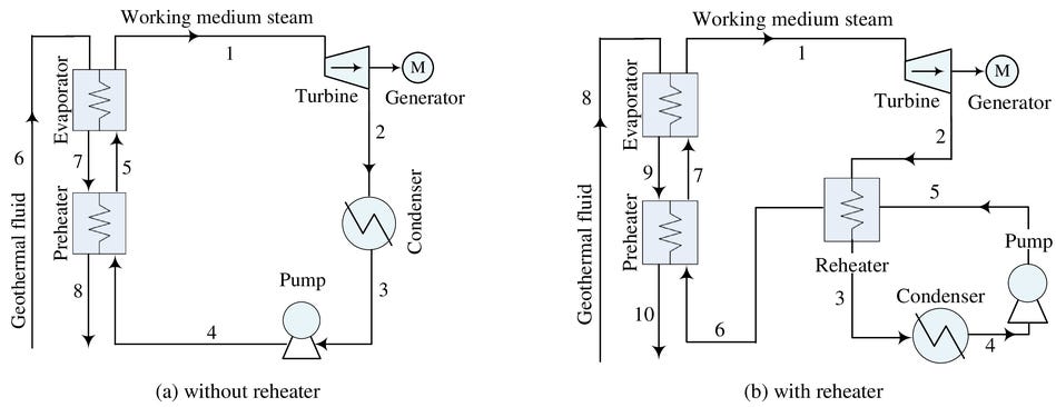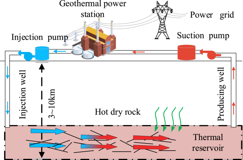 HDR geothermal systems employ similar technology to oil and gas fracking, where a geothermal power plant is built by creating a geothermal reservoir by drilling deep wells into hot rocks. Drilling fractures the rocks and helps to create a system to facilitate heat transfer that generates electricity. Once the rocks are fractured, injection and production wells are established so that water pumped down through the injection well can circulate through the fracture network, absorb heat from the surrounding hot dry rock, and return to the surface via the production well. At that point, a heat exchanger is used to transfer the heat from the hot water to a working fluid. This fluid then changes into “high-temperature and high-pressure [vapor] in the evaporator, and then enters the turbine to expand and do work,” generating electricity in the process (Figures 3 and 4).