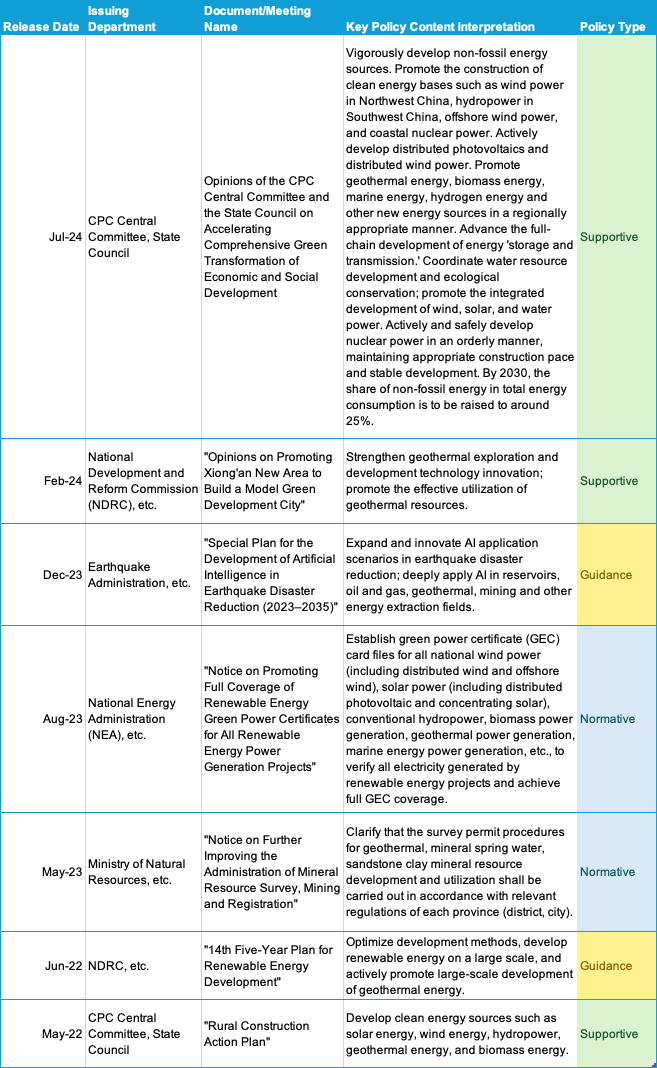 These initiatives did not appear out of thin air but were instead guided by policy directives in recent years. Qianzhan Research Institute highlighted a few key policies that have been instrumental to renewing geothermal development efforts (Figure 9). In general, the Central Committee, the State Council, and the National Development and Reform Commission (NDRC) are responsible for issuing broad, general policy directives in speeding up renewable energy development. It is clear that geothermal energy lacks a clear target and is instead lumped with other, much more popular and scalable forms of renewable energy.
