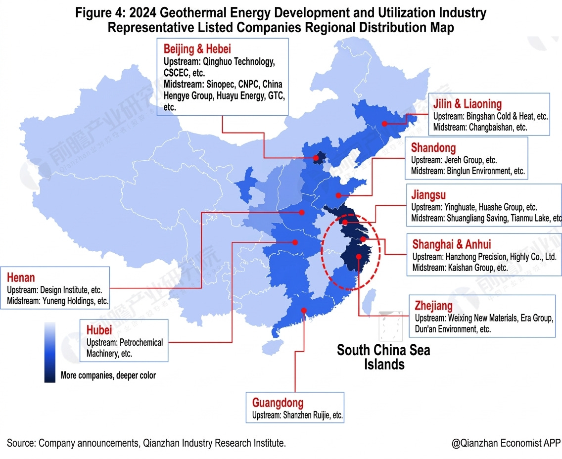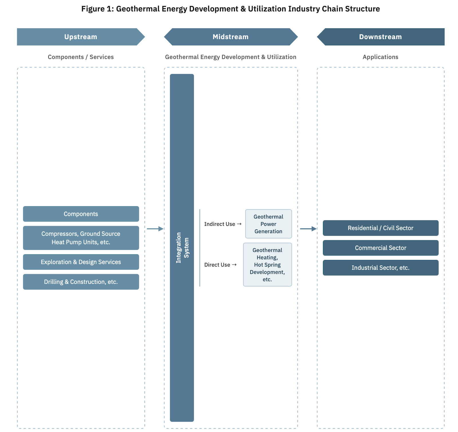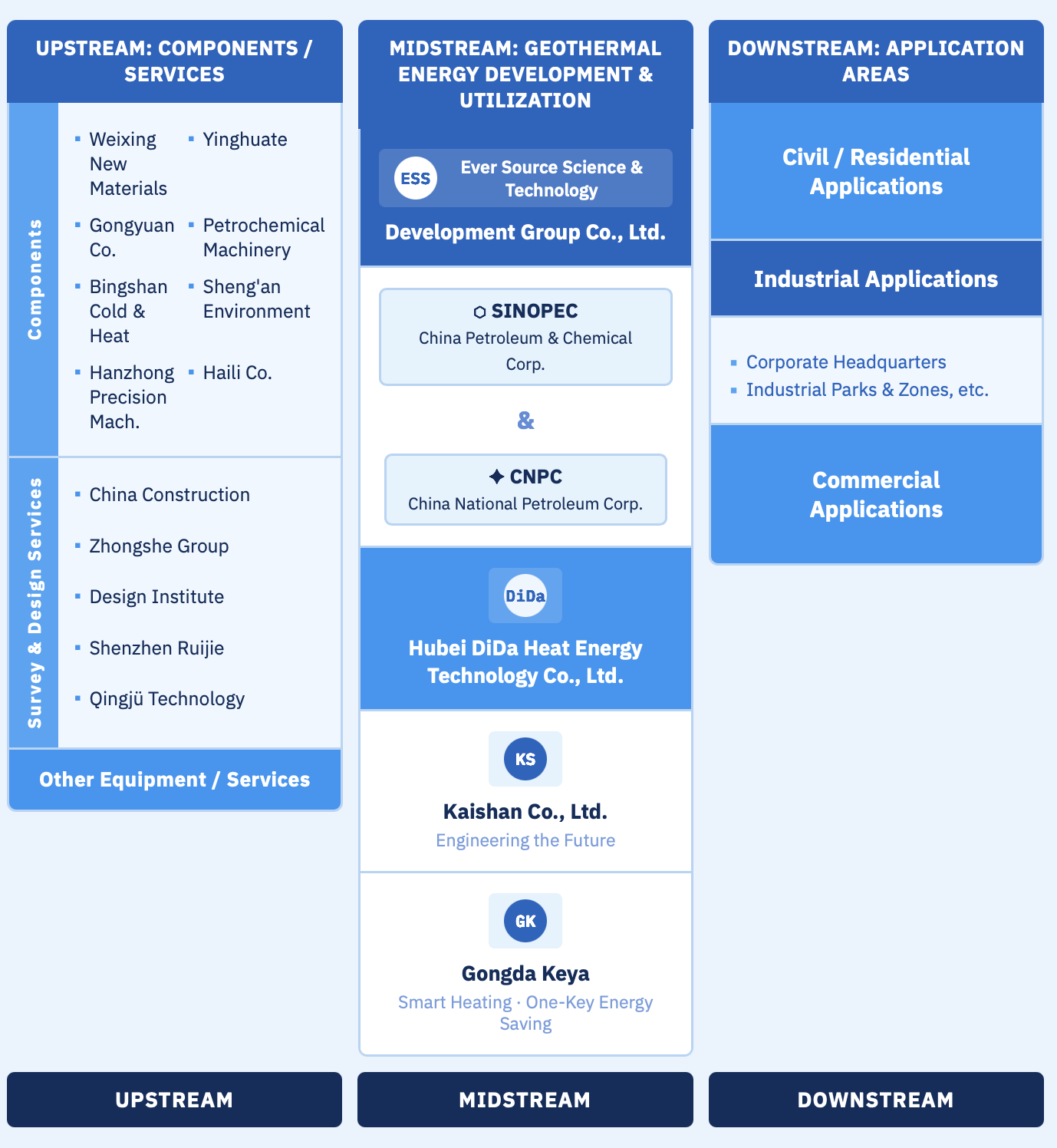 The production chain of geothermal development can be broadly classified into three categories: upstream, midstream, and downstream. Upstream companies generally consist of manufacturing and engineering firms that provide materials, survey equipment, and necessary expertise for midstream companies. Research institutes such as the Chinese Academy of Sciences also assist in geological site exploration. Midstream companies such as Sinopec operate and maintain the services once the geothermal wells have been established, while downstream companies directly benefit from these services.