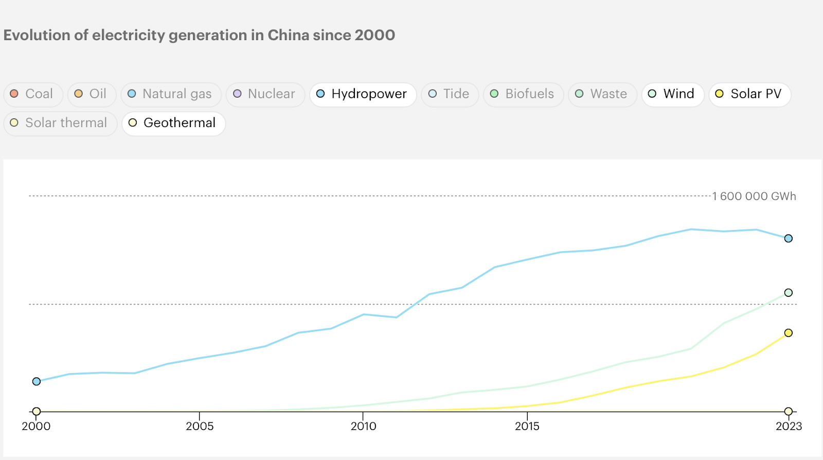 The government’s intense focus on those three types of renewables has left geothermal energy significantly underdeveloped. The Our World in Data project estimates that only 1.34% of China’s energy consumption is sourced from “other renewables” in 2024, while the International Energy Agency estimates that in 2023, China generated a measly 195 GWh of electricity from geothermal sources, compared to 1,285,850 GWh from hydropower, 885,870 GWh from wind, and 584,150 GWh from solar PV. Despite recent policy initiatives to ramp up geothermal energy development, it is unlikely that this vast gap can be bridged in the near future.